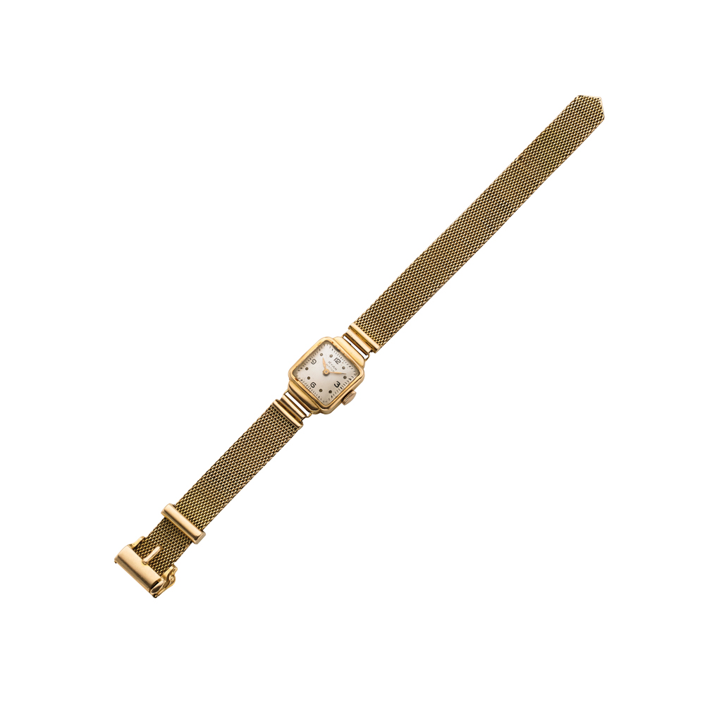RYAN Orologio da polso da donna in oro 18K, con bracciale non pertinente Anni 1950 ca. Quadrante firmato Movimento con carica manuale Quadrante argentato con indici e cifre arabe (probabile ristampa) Cassa n.165102-287, g.36 Misura mm 16x20 RYAN Women's gold wristwatch with non-matching band Manual-wind movement Silver-plated dial with time indicators and Arabic numerals (probably reprint)