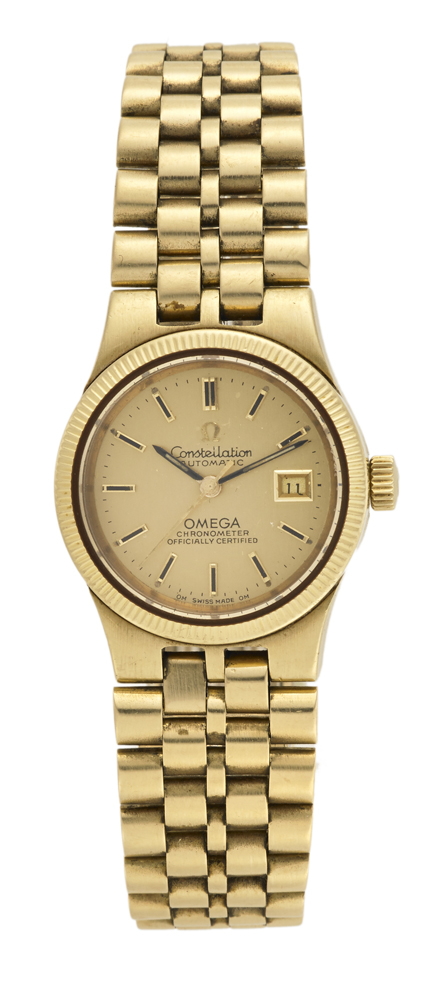 OMEGA CONSTELLATION Orologio da polso da donna in oro 18 K, con bracciale non pertinente Anni 1980 ca Quadrante, movimento e cassa firmati Movimento con carica automatica Quadrante champagne con indici riportati, finestrella per la data Cassa n. 5880019, cal. 685 Diam. mm 26 OMEGA CONSTELLATION Lady's gold wristwatch with non-matching band Automatic-wind movement Champagne dial with applied time indicators