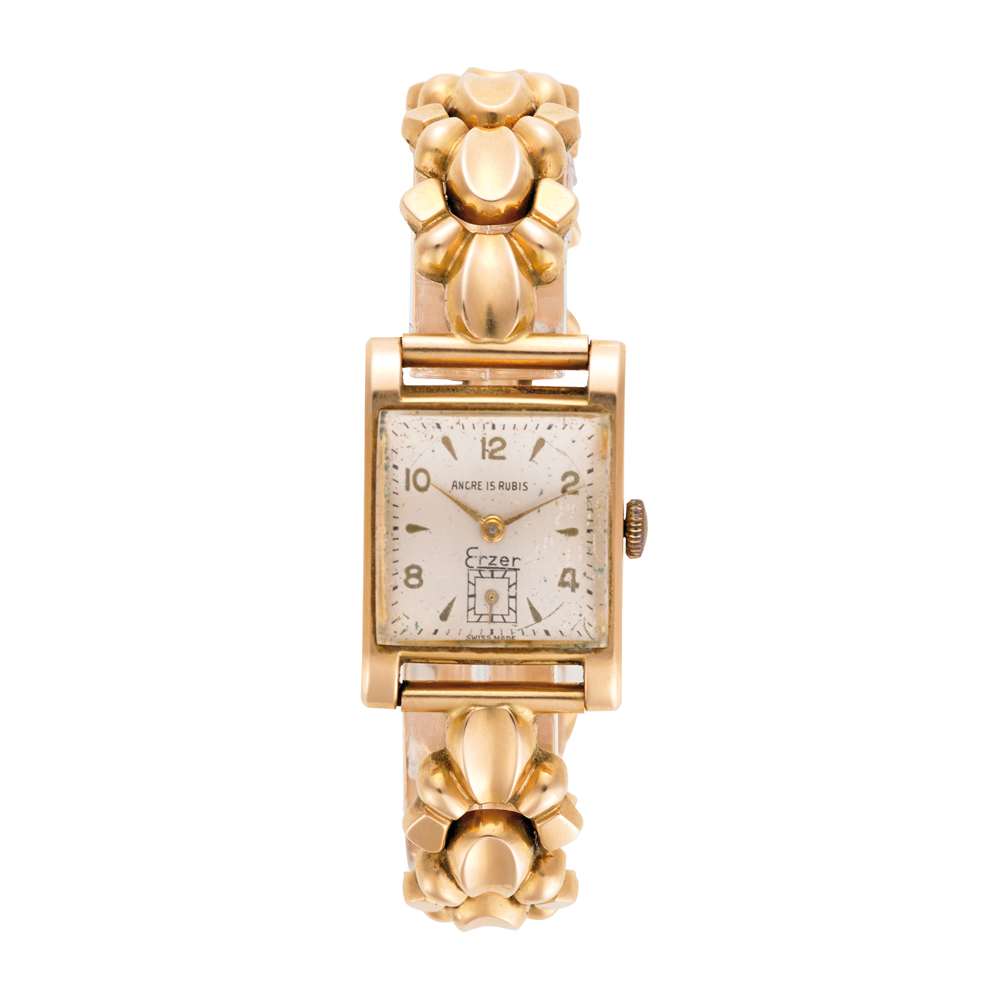 ERZER Orologio da polso da donna in oro 18 K con bracciale in oro non pertinente. Fine anni '40, inizio '50 Quadrante firmato Movimento con carica manuale Quadrante argentato con numeri arabi e indici, piccoli secondi al sei Misura mm 21x30 EERZER Lady's gold wristwatch with non-matching gold band Manual-wind movement Silver-plated dial with Arabic numerals