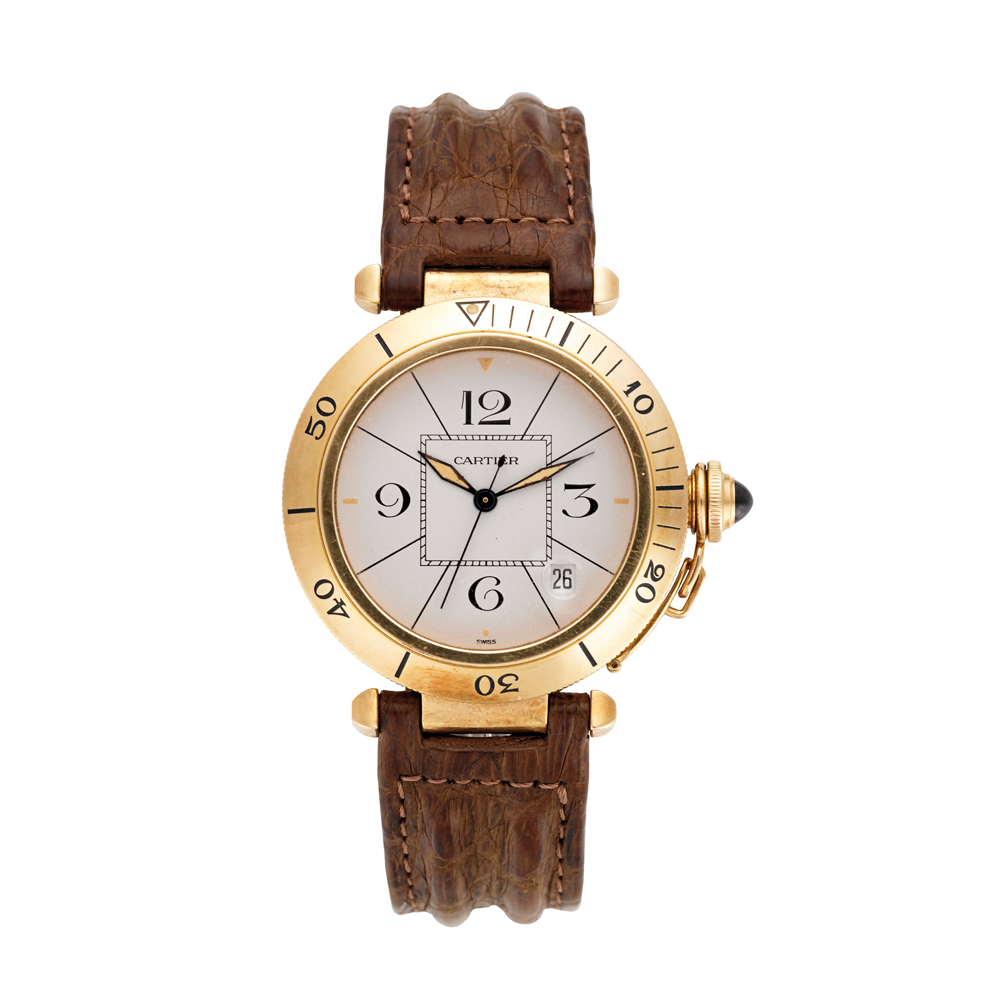 CARTIER Orologio da polso da uomo in oro 18K Anni 1990 Quadrante, movimento e cassa firmati Movimento con carica automatica Quadrante argentato con cifre arabe, secondi al centro, data Cassa n. 1987 0634-820903 Diam. mm 38 CARTIER Men's gold wristwatch Automatic-wind movement Silver-plated dial with Arabic numerals