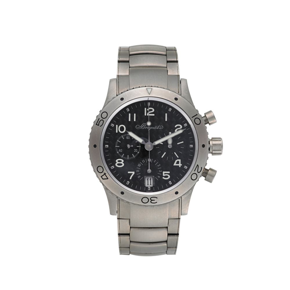 BREGUET Cronografo Orologio da polso da uomo in titanio Anni 1990 ca. Quadrante, movimento e cassa firmati Movimento con carica automatica Quadrante con cifre arabe, quadrantini ausiliari con minuti, ore e secondi Type XX Cassa n. 75885 Diam. mm 40 Con scatola e garanzia BREGUET Chronograph Men's titanium wristwatch Automatic-wind movement Dial with Arabic numerals With box and guarantee