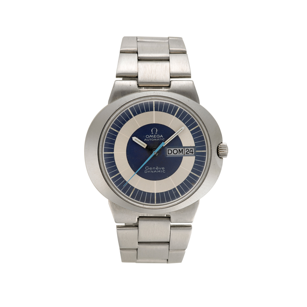 OMEGA DYNAMIC Orologio da polso da uomo in acciaio, con bracciale integrato Anni '70 Quadrante movimento e cassa firmati Movimento con carica automatica Quadrante azzurro con fascia argentata Misure mm 37x42 OMEGA DYNAMIC Men's steel wristwatch with integrated band Automatic-wind movement Blue dial
