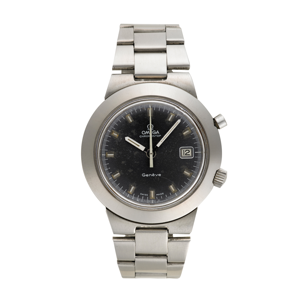 OMEGA CHRONOSTOP Orologio da polso da uomo in acciaio con bracciale originale Epoca anni '70 Quadrante, movimento e cassa firmati Movimento con carica manuale Quadrante nero con indici riportati Diam. mm 41 OMEGA CHRONOSTOP Men's steel wristwatch with original band Manual-wind movement Black dial with applied time indicators