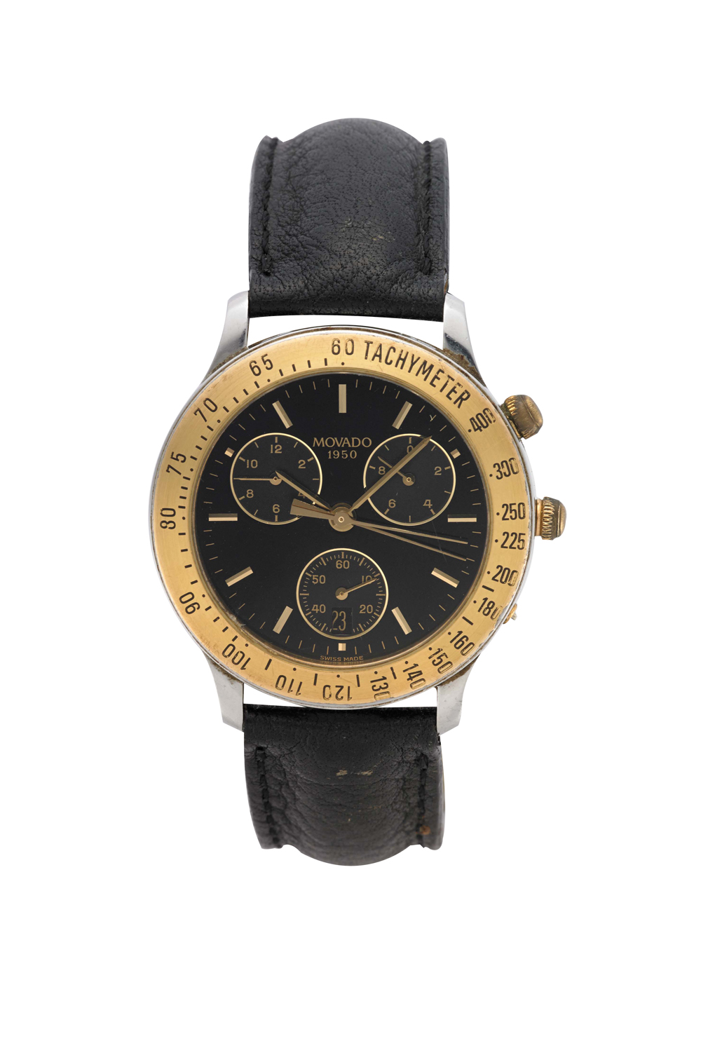 MOVADO Orologio cronografo da polso da uomo in acciaio Epoca fine anni '70 primi anni '80 ca. Quadrante, movimento e cassa firmati Movimento al quarzo Quadrante nero, quadrantini ausiliari per ore, minuti e secondi Cassa n.81A5863, Mancante di pulsante, non funzionante Cassa n. 81A5863 Diam. 38mm MOVADO stainless steel chronograph wristwatch, late 1970s/early 1980s circa Quartz movement (loss of the button)