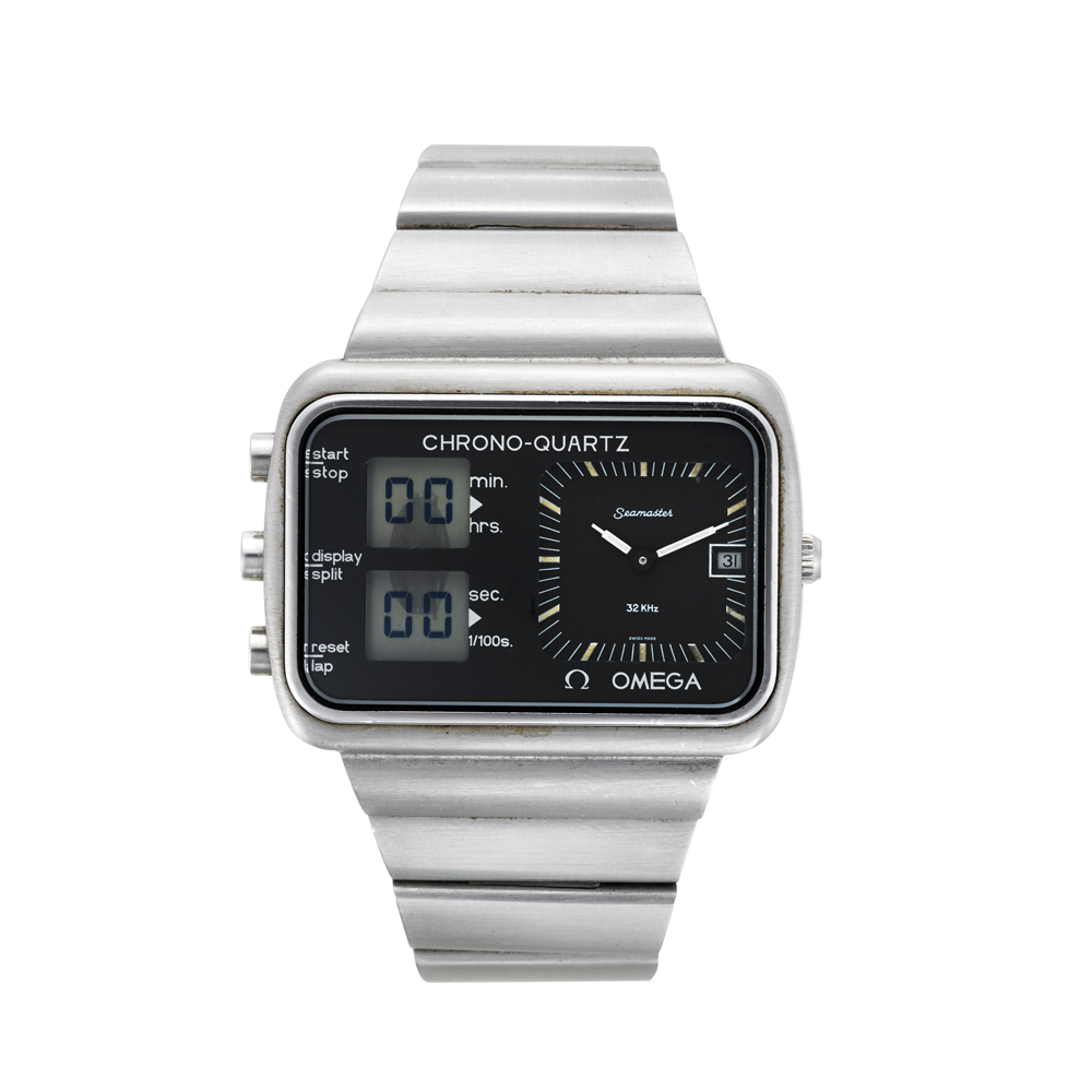 OMEGA CHRONO QUARZ Orologio da polso da uomo in acciaio con bracciale integrato originale Epoca anni '70 Quadrante movimento e cassa firmati Movimento al quarzo Quadrante nero, data, e finestrelle per il conteggio cronografico elettronico Cassa n. 19600523960839 Misura mm 47x37 OMEGA CHRONO QUARTZ Men's steel wristwatch with original integrated band Quartz movement Black dial