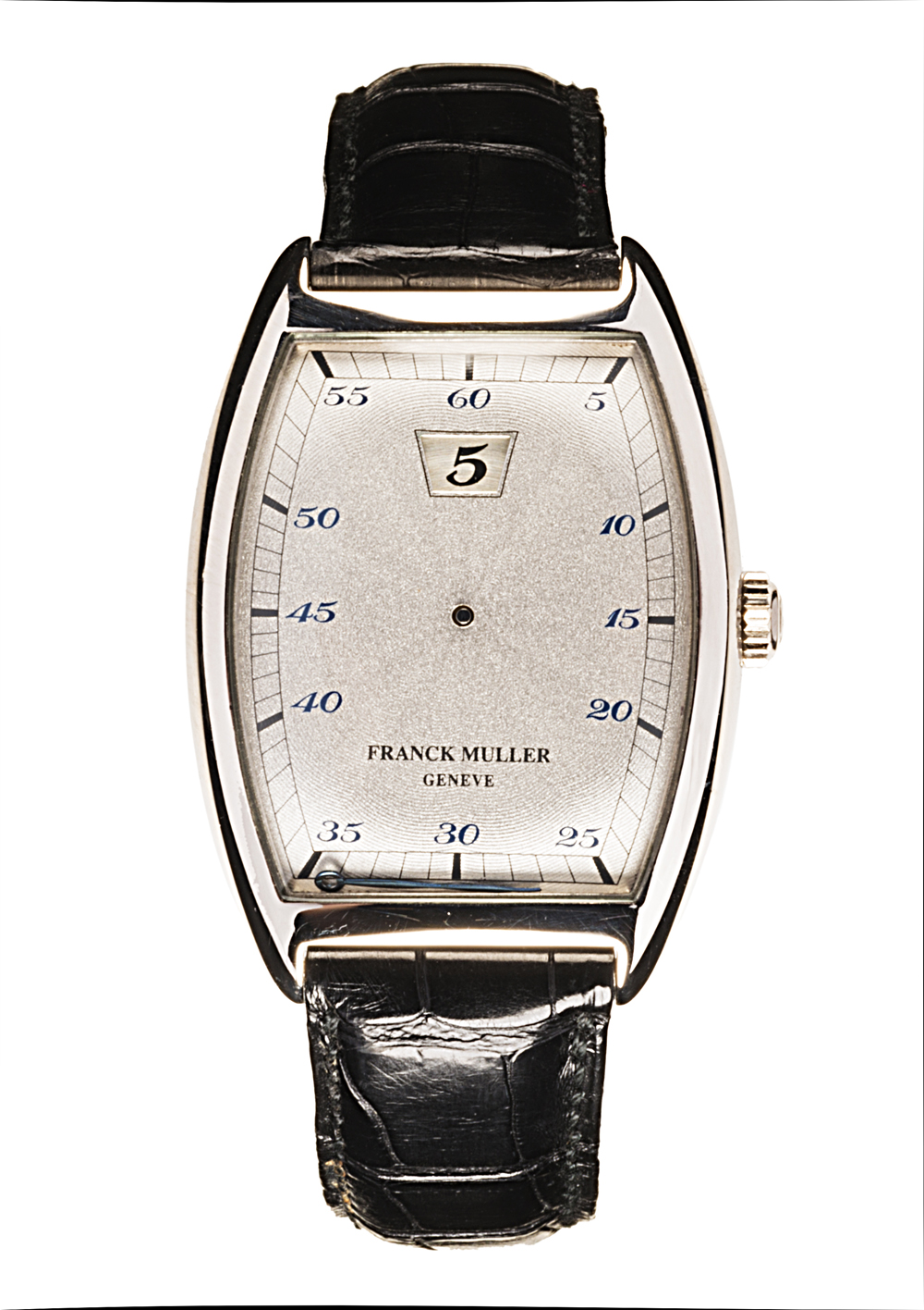 FRANCK MULLER Jump Hour Orologio da polso da uomo in oro bianco 18K Anni 1990 ca. Quadrante, movimento e cassa firmati Movimento con carica manuale Quadrante argentato con finestrella sotto ore 12 per ora e grafica esterna per i minuti, una sola lancetta Cassa ref. n.2852HS-n.03 Misura 32x41mm FRANCK MULLER Jump Hour Men's white gold wristwatch, approx. 1990s