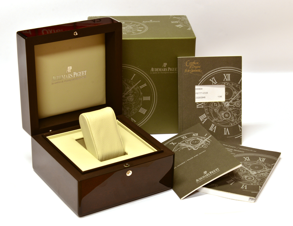 AUDEMARS PIGUET Custodia portaorologio in legno laccato. Con garanzia originale ref. n. 261200R.OO D088CR01 Rif. orologio venduto a "Il Ponte casa d'aste", asta n. 316 del 27/11/2013 lotto n. 466 AUDEMARS PIGUET Wooden watch case with original warranty
