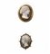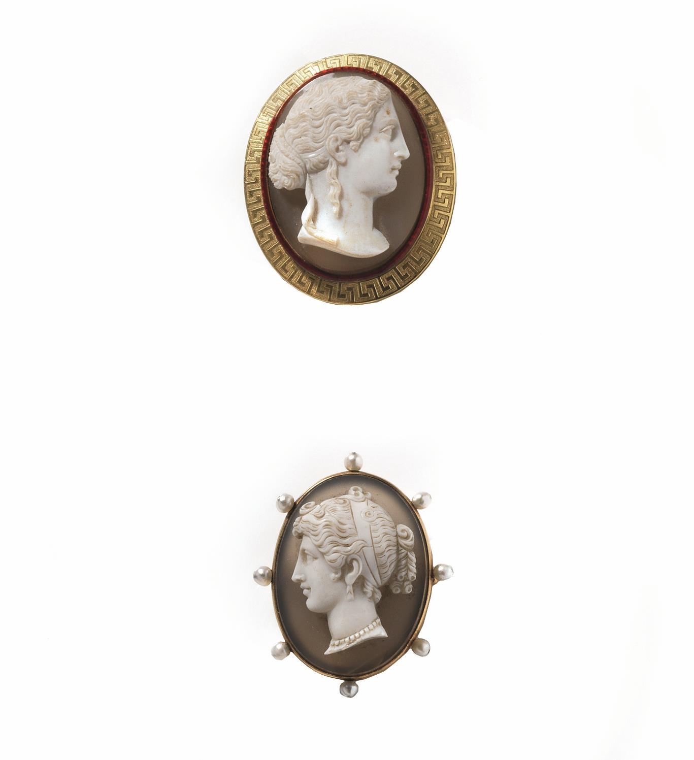 rispettivamente di forma ovale con cornice incisa a greca in oro giallo e smalto rosso, al centro un cammeo in calcedonio con profilo femminile; di forma ovale con cornice in oro e perle con cammeo in calcedonio raffigurante profilo femminile, 44 g