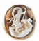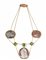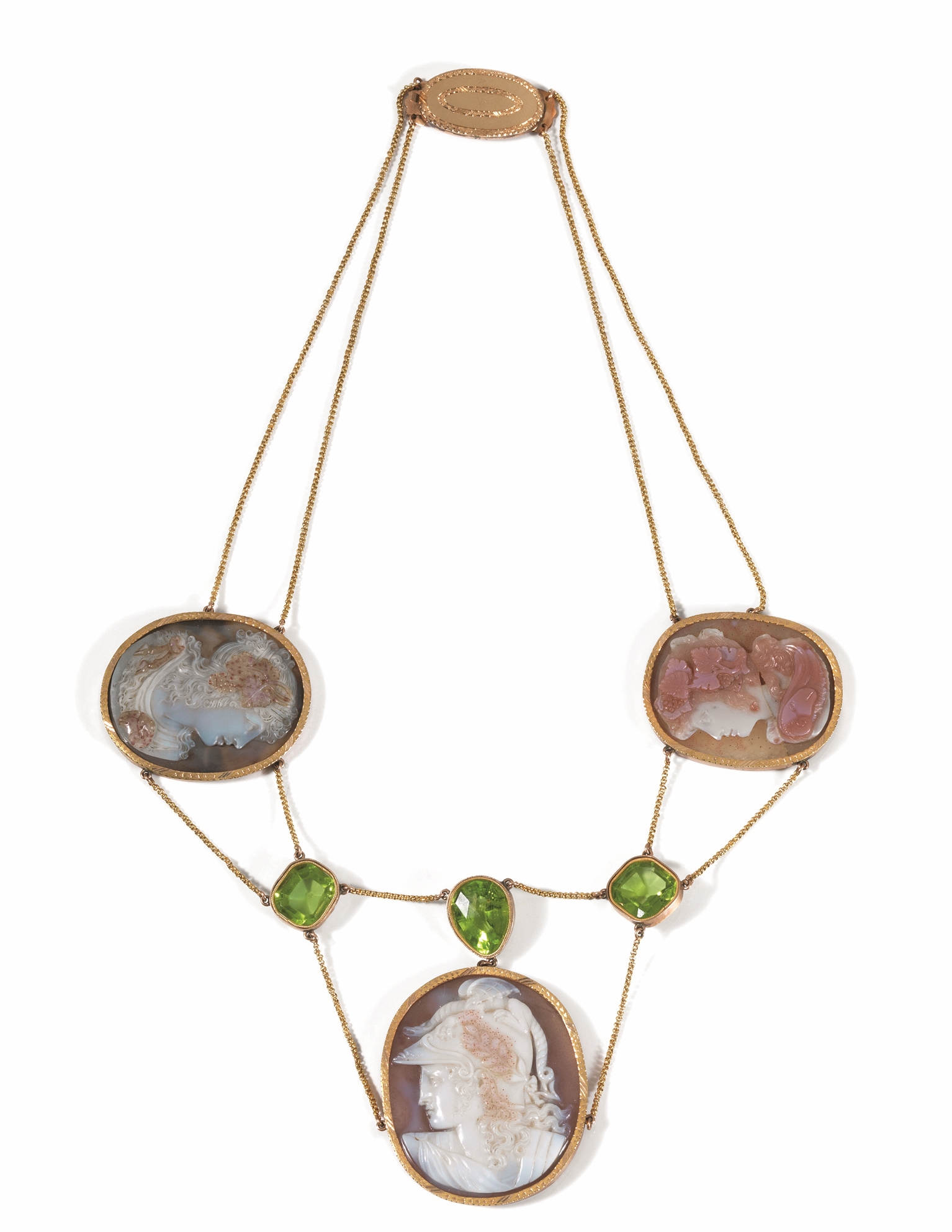 composta da tre cammei in calcedonio, di cui uno doppio, uniti da catenine in oro giallo e peridoti sfaccettati, 53 g entro scatola Mazzoleni una frattura in un cammeo