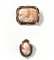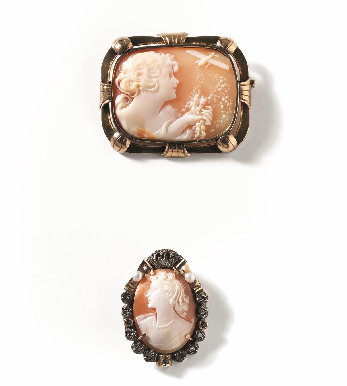 realizzati in stile Liberty, rispettivamente come spilla pendente con cammeo in conchiglia di forma ovale entro cornice in oro, argento, perle, zaffiri e schegge di diamante, punzone 500; di forma rettangolare in conchiglia entro cornice in oro e perle, 37 g