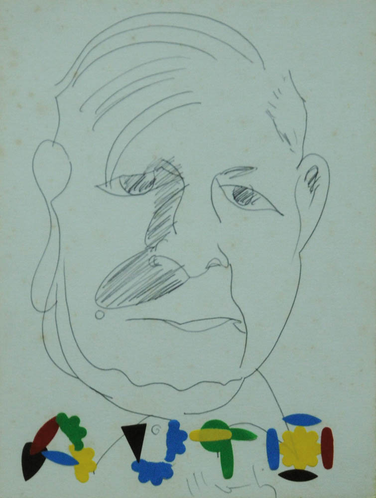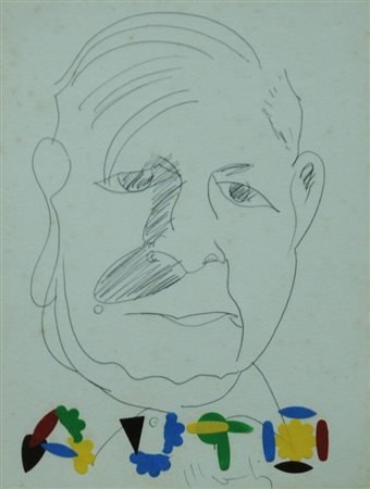 ALDO MONDINO 1938 - 2005 " Auto ", 1973 Matita e collage su carta, cm. 24 x 18,5 Firmato in basso al centro Autentica Archivio Mondino su fotografia Prov. Collezione Privata