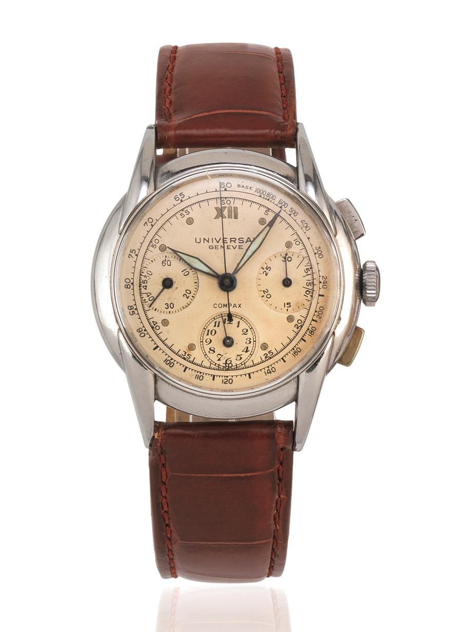 OROLOGIO DA POLSO CON CRONOGRAFO UNIVERSAL GENEVE COMPAX, REF. 22496, SERIALE N. 972’961, ANNI 1942-’43 CIRCA, IN ACCIAIO