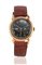 Cassa in due corpi in oro lucido, fondello a scatto, anse a goccia. Quadrante nero con indici a bastone e puntiformi sfaccettati e numero arabo, due finestrelle ad ore 3 e 9 con giorni della settimana e mese, lancette ad ago, lancetta del datario con estremità a punhta di freccia, secondi a ore 6. Movimento a carica manuale calibro 475. Cinturino in pelle con fibbia ad ardiglione in metallo dorato, cassa, quadrante e movimento firmati
