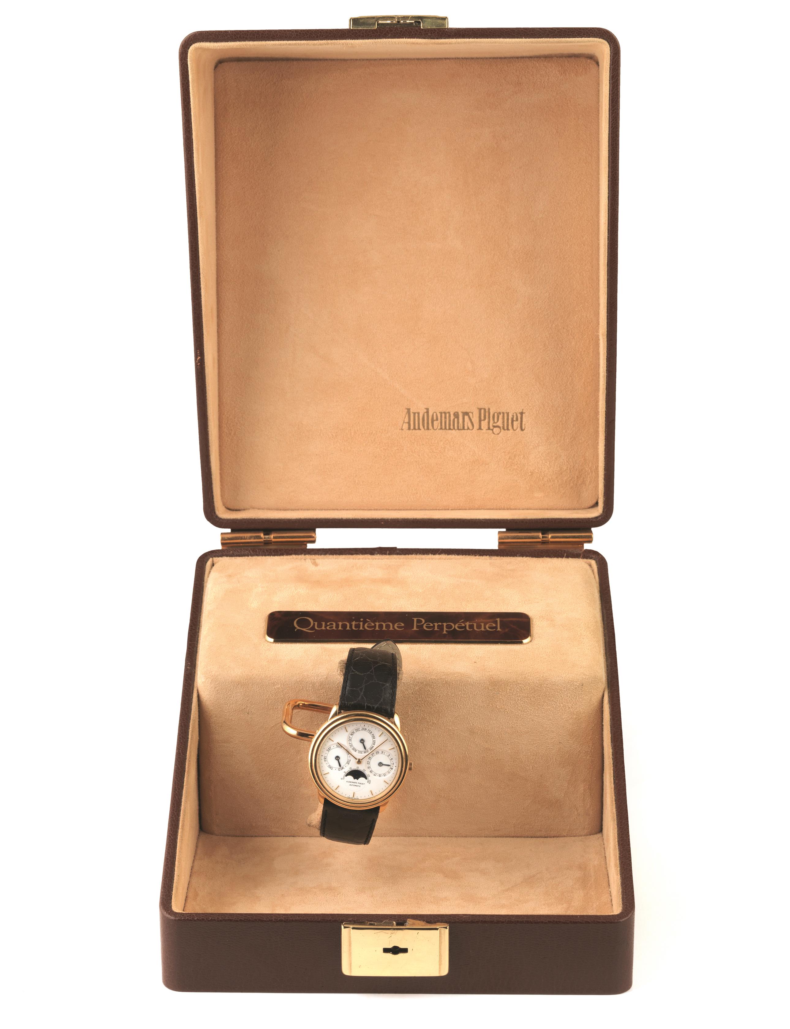 OROLOGIO DA POLSO CON CALENDARIO PERPETUO E FASI LUNARI AUDEMARS PIGUET QUANTIEME PERPETUEL, N. 2657, CASSA N. C34532, IN ORO GIALLO 18 KT, CON SCATOLA MECCANICA