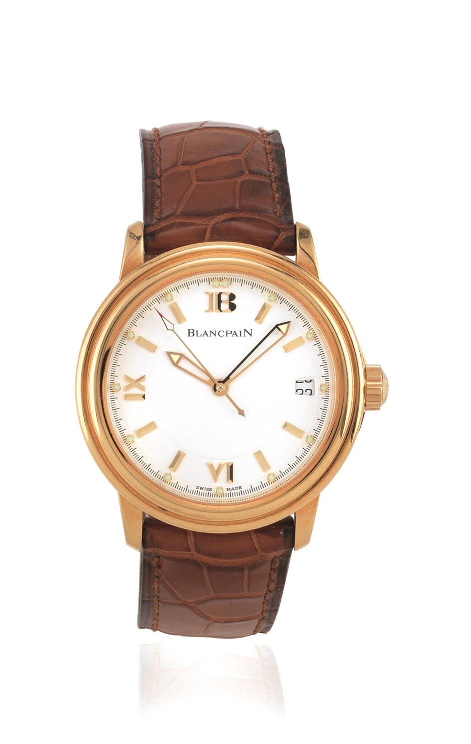 Cassa in due corpi in oro lucido, fondello a vite, lunetta scanalata a doppio anello. Quadrante bianco con indici applicati a bastone sfaccettato, numeri romani e puntiformi con inserto in materiale luminescente, lancette traforate con inserto in materiale luminescente, datario ad ore tre, secondi al centro. Movimento a carica automatica calibro 11.51. Cinturino in pelle con fibbia ad ardiglione in oro Blancpain, cassa, quadrante e movimento firmati