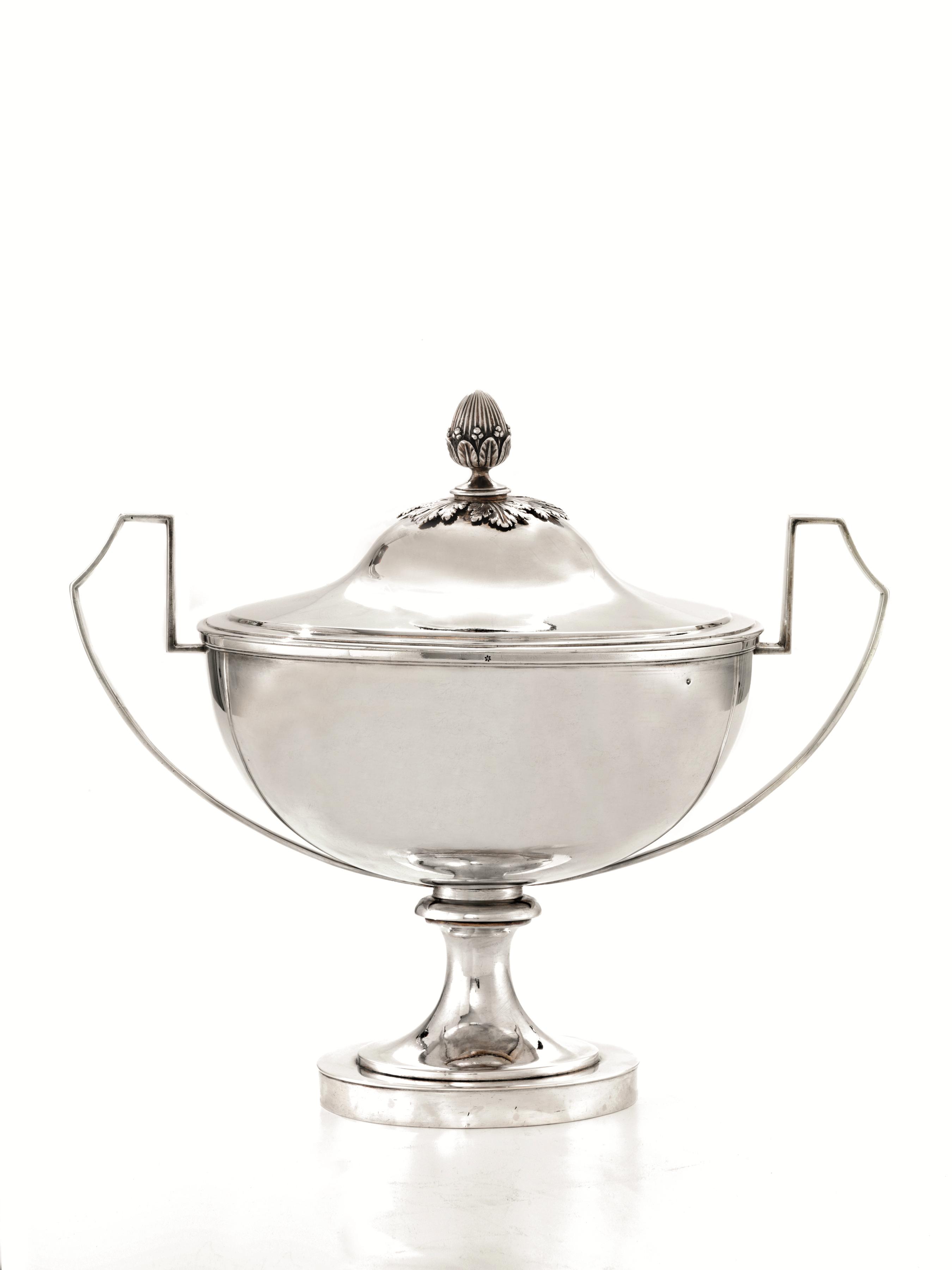 in argento, di forma circolare su piede ovale, due anse geometriche, finale del coperchio a pigna, alt. cm 37, g 3500