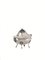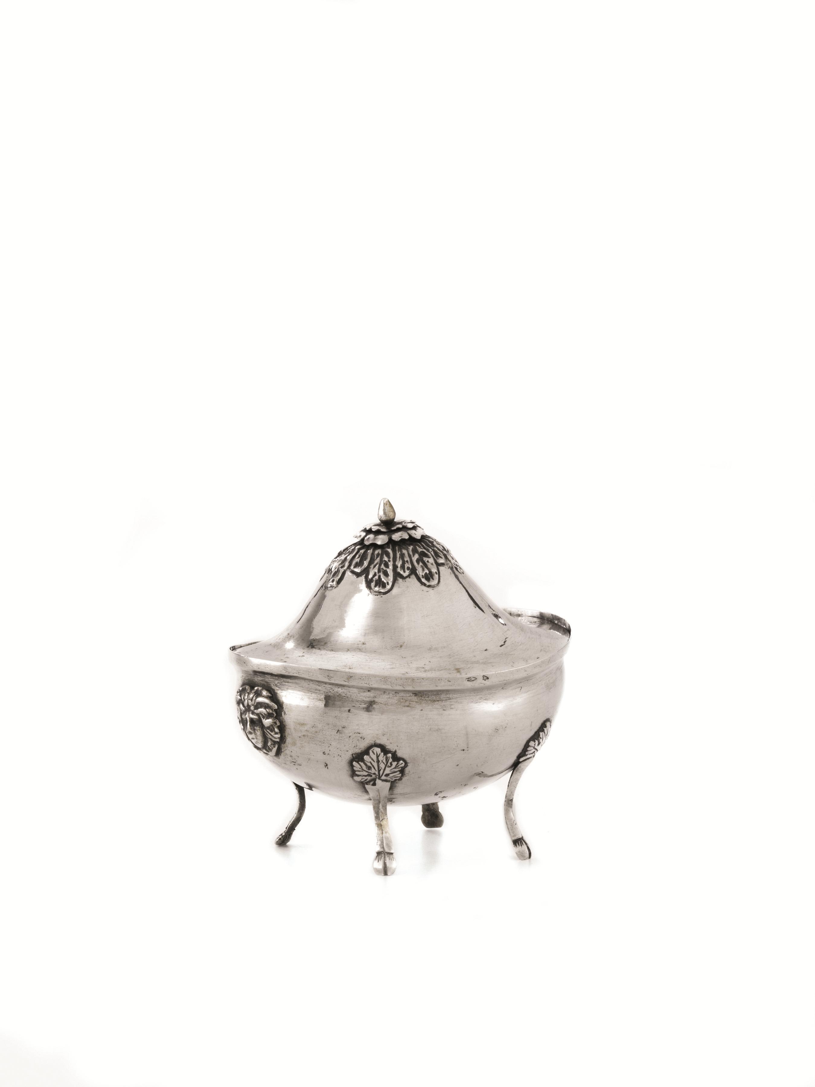 in argento di forma ovoidale, quattro piedini uniti al corpo da elementi fogliacei, due anse a protomi femminili, finale del coperchio modellato a fiore, cm 11x9, g 135