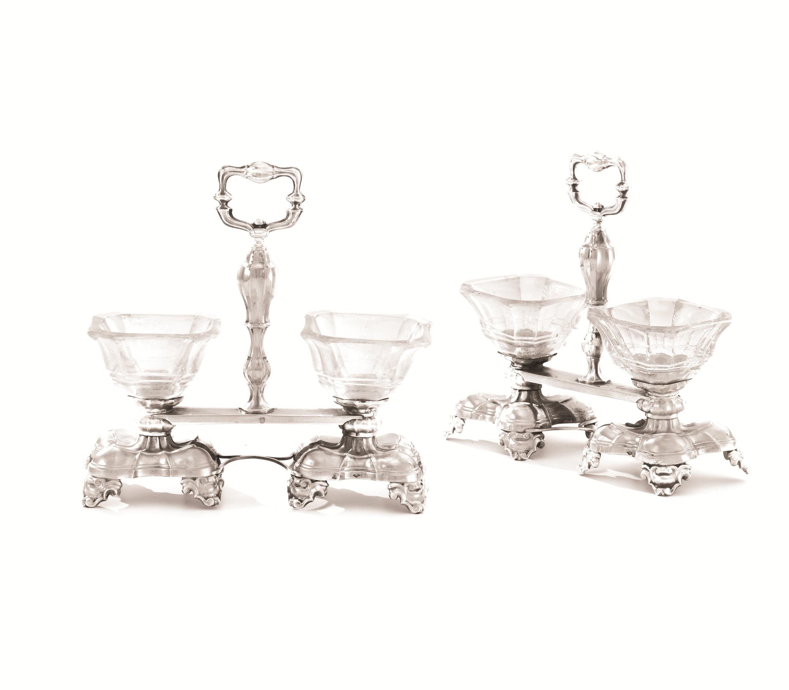 in argento, ciascuna a due alloggi in cristallo poggianti su basi quadrangolari, fusto centrale a balaustro e presa sagomata, alt. cm 16,5, g 755 lordi (2)