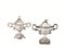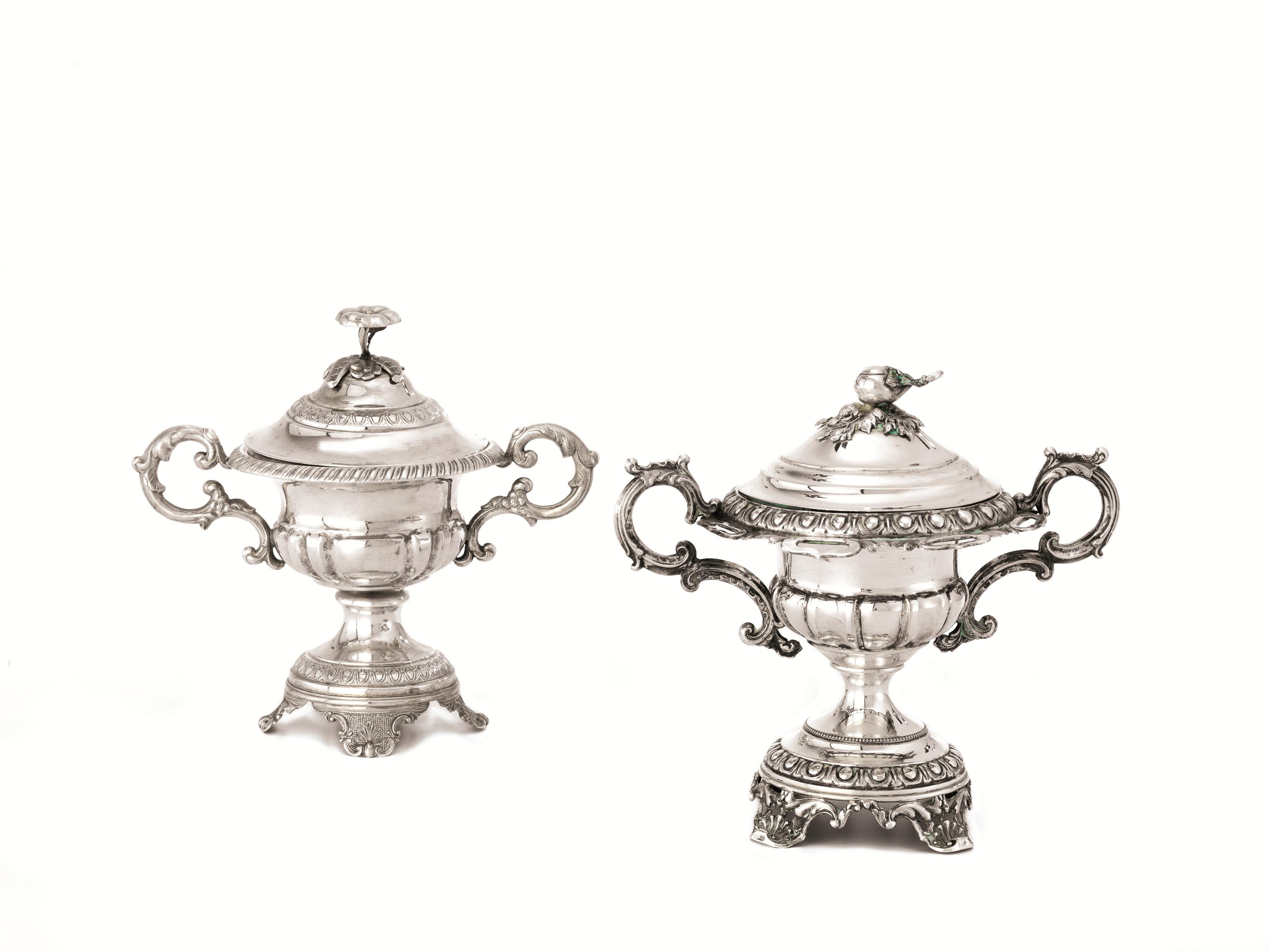 in argento, corpi semisferici sbalzati a costolonature, anse a volute vegetali, finali dei coperchi modellati rispettivamente a fiore e pomo, alt. cm 18, complessivi g 545 (2)
