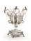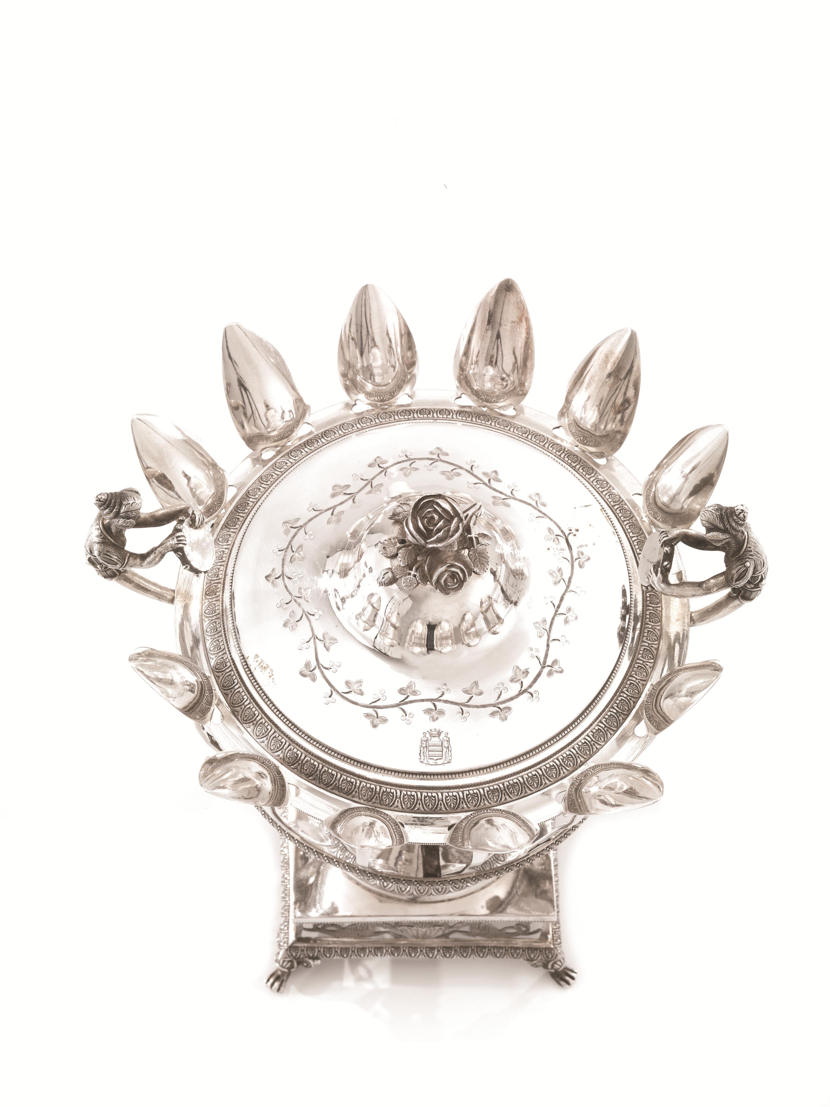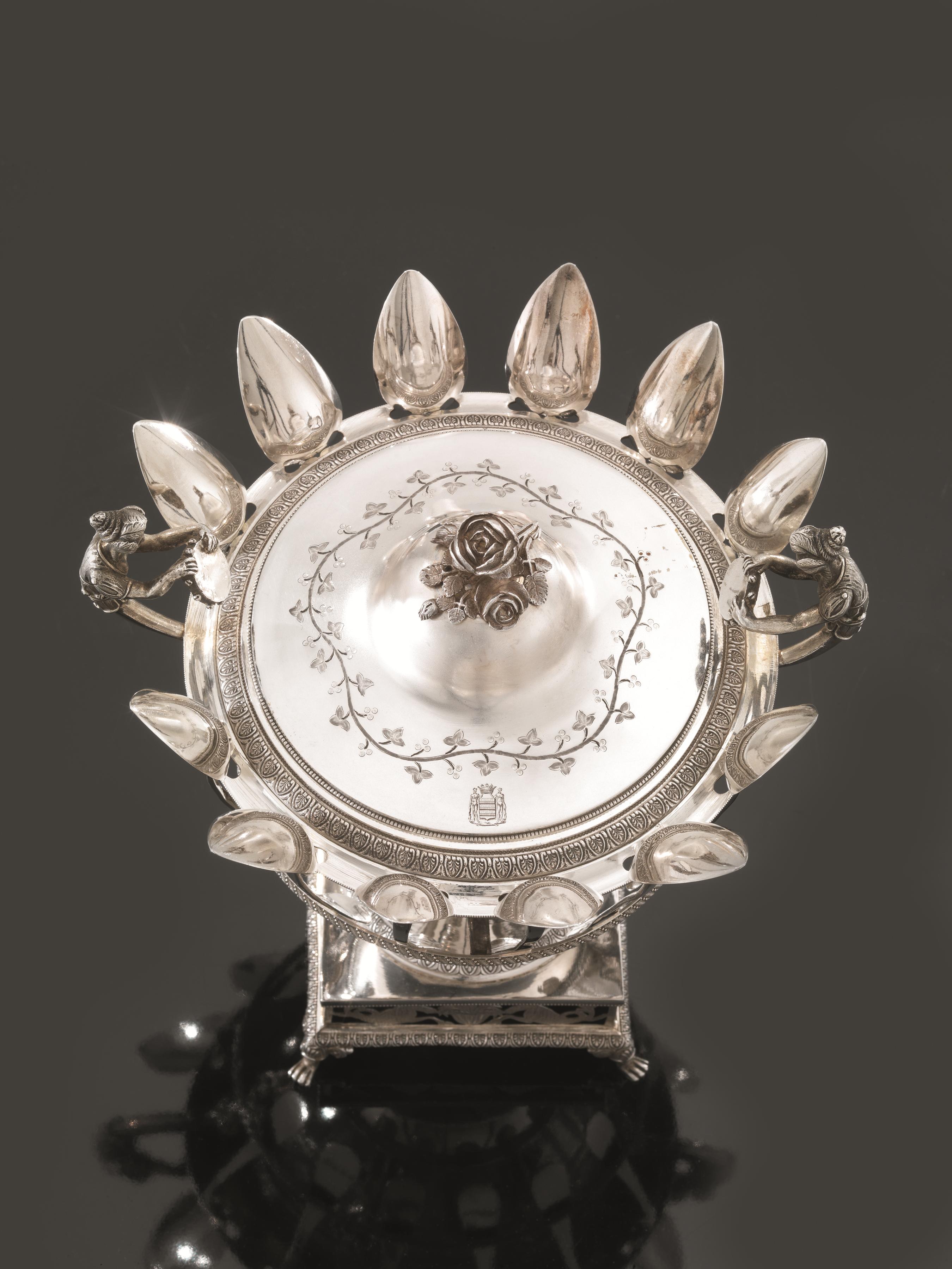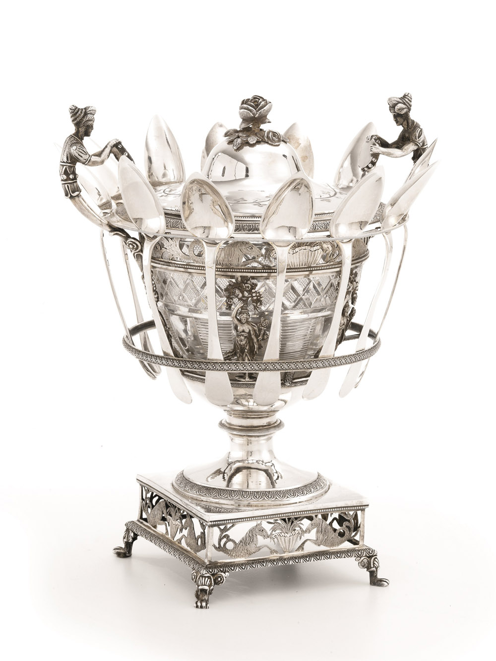 base quadrata con bordo traforato ad animali fantastici e vasi, coppa in cristallo tagliato su sostegno con lesene realizzate come figure femminili con cornucopie e vaso di fiori sulla testa, bordo traforato con analogo motivo della base, due anse con finali modellati a figure femminili con tamburello, coperchio con presa a bocciolo di rosa, completa di dodici cucchiaini coevi realizzati dall'argentiere Francois Nicolas a Parigi, alt. cm 25, g 1090