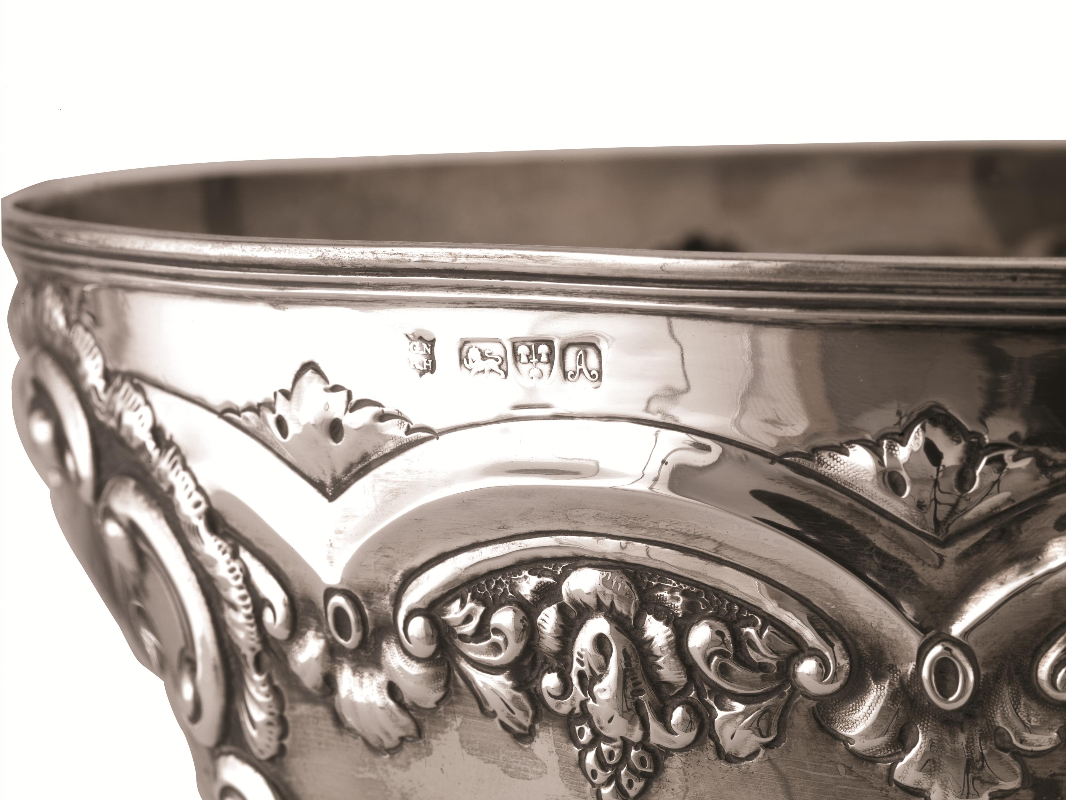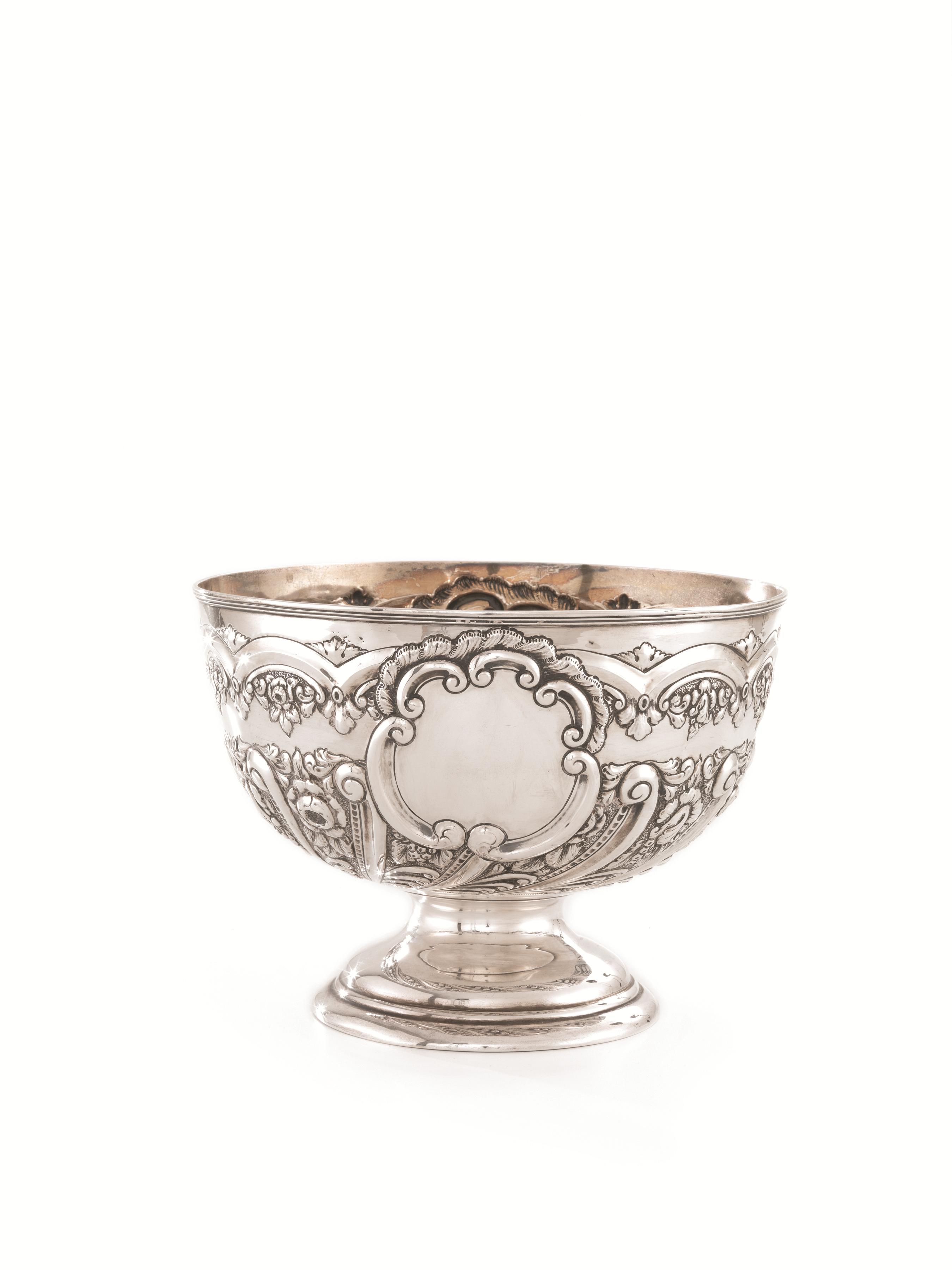 di forma circolare con corpo riccamente sbalzato a volute e fiori, diam. cm 25, alt. cm 18,5, g 750