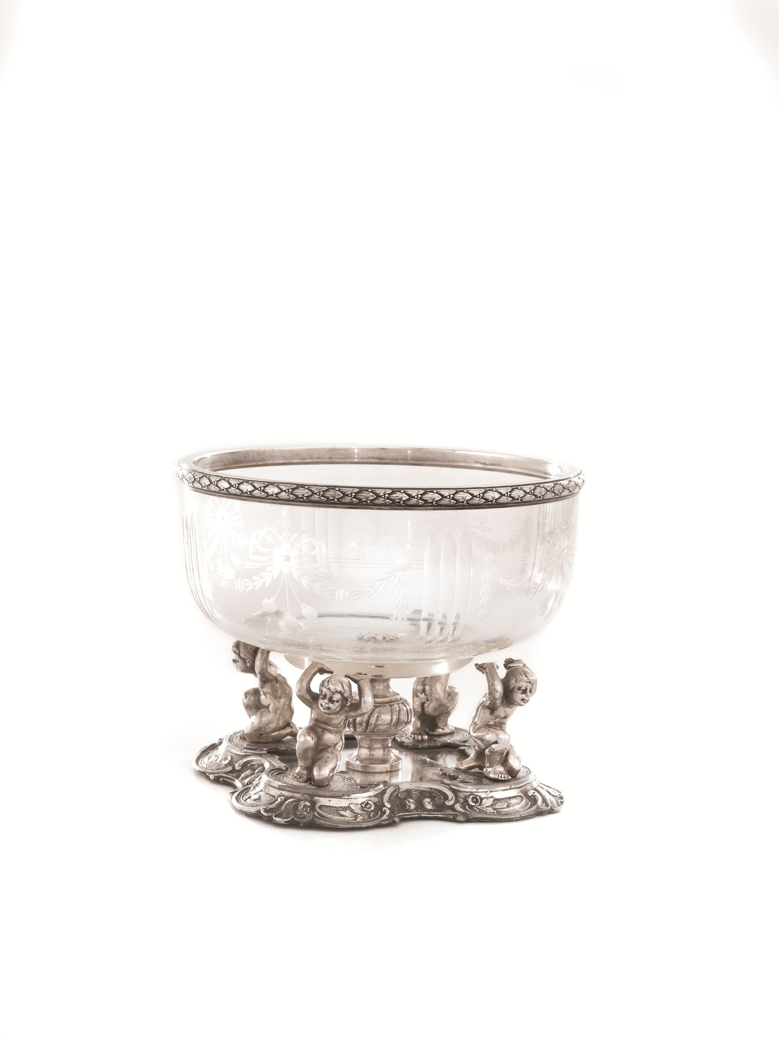 base quadrilobata in argento su cui siedono quattro fanciulli che sostengono una coppa circolare in cristallo, alt. cm 19, diam. cm 23, base appesantita