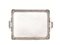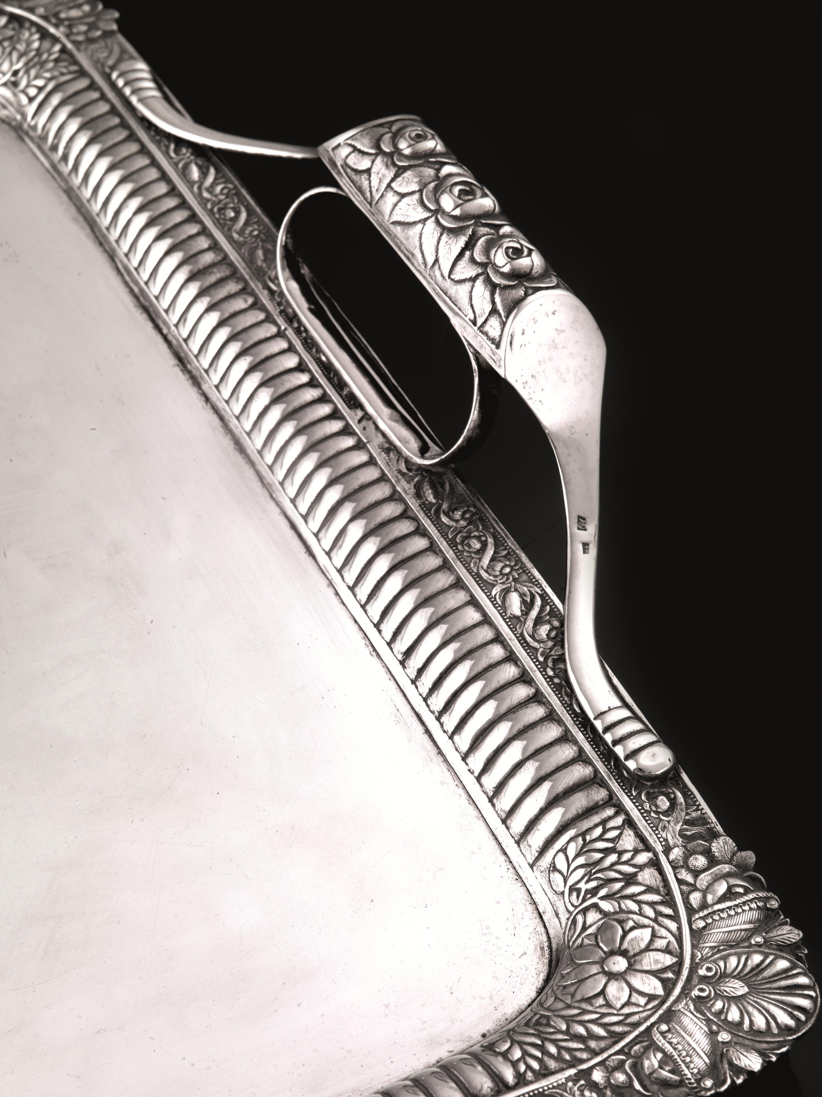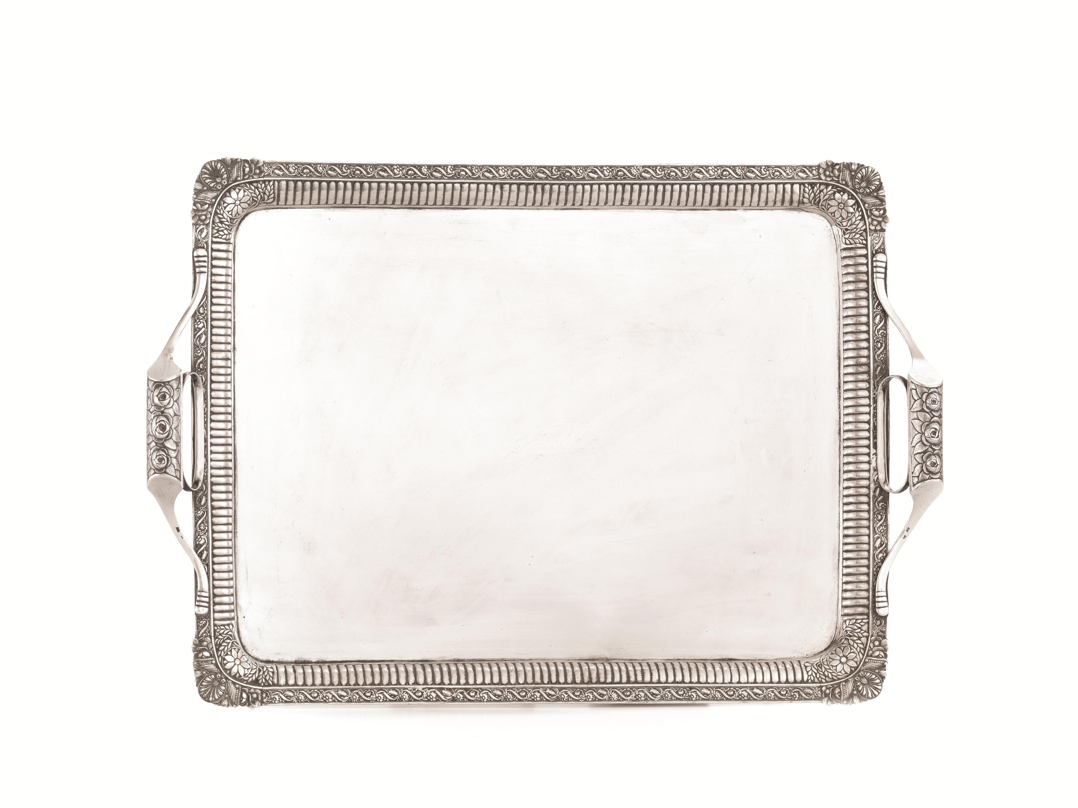 in argento, di forma rettangolare, tesa sbalzata a baccellature, agli angoli tralci fogliacei e fiori, profilo a festoni di rose, anse decorate da boccioli di fiori, cm 62x41, g 2260