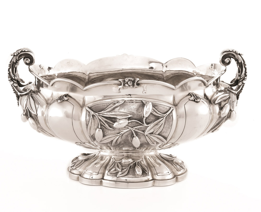 di forma ovale, in argento sbalzato e decorato da tralci di ulivo, due anse realizzate come elementi fogliacei, cm 45x30, g 2545