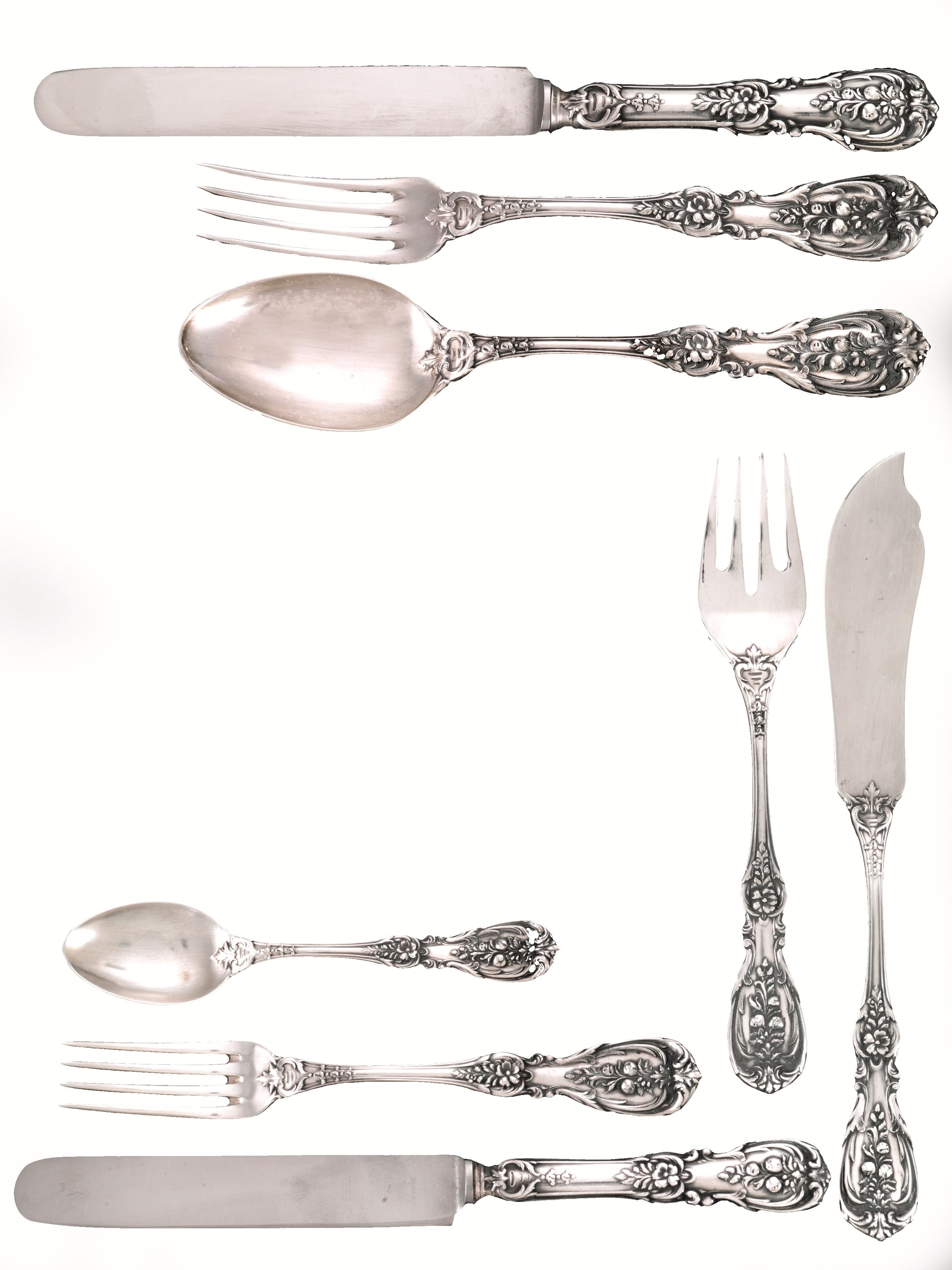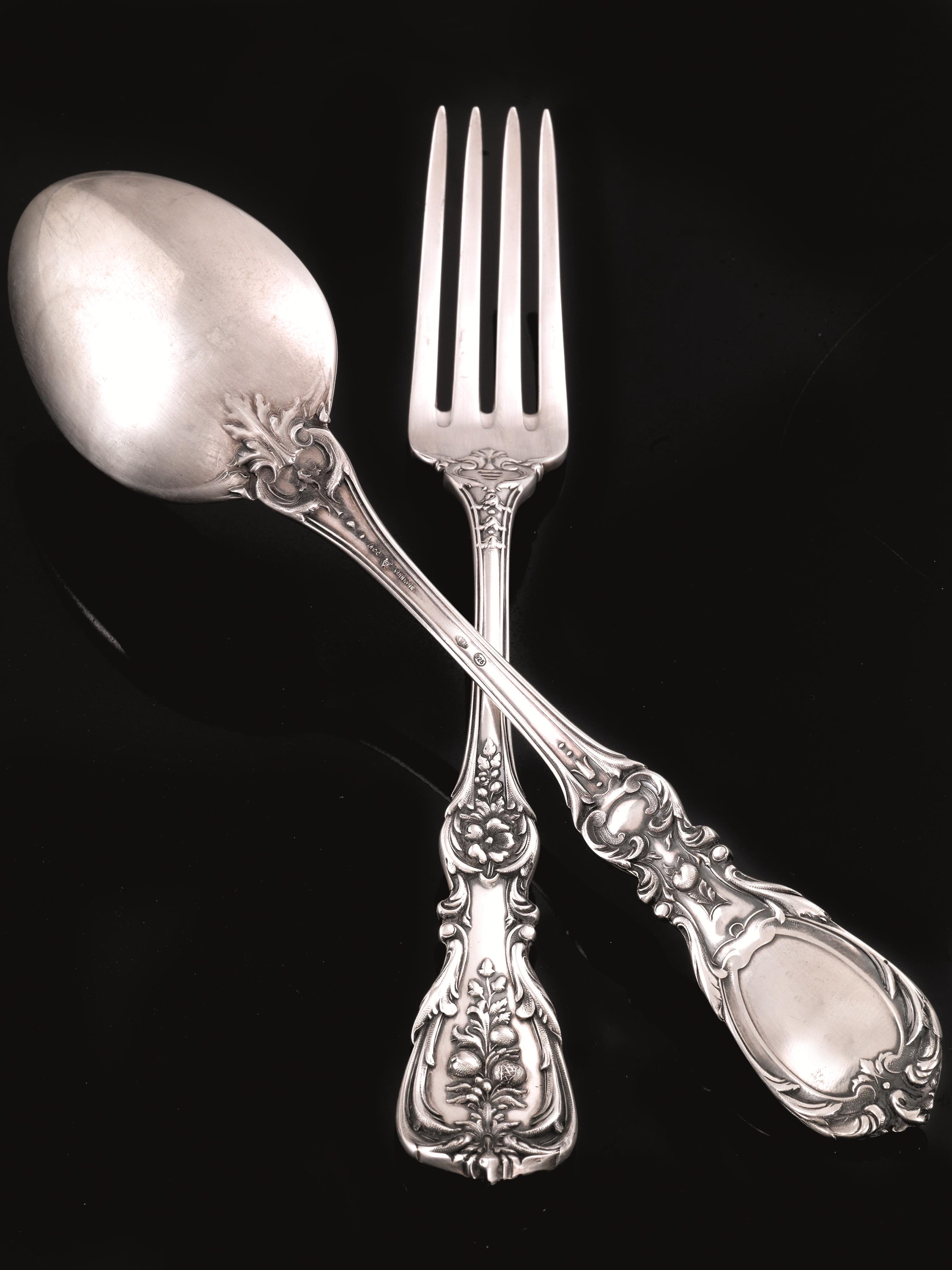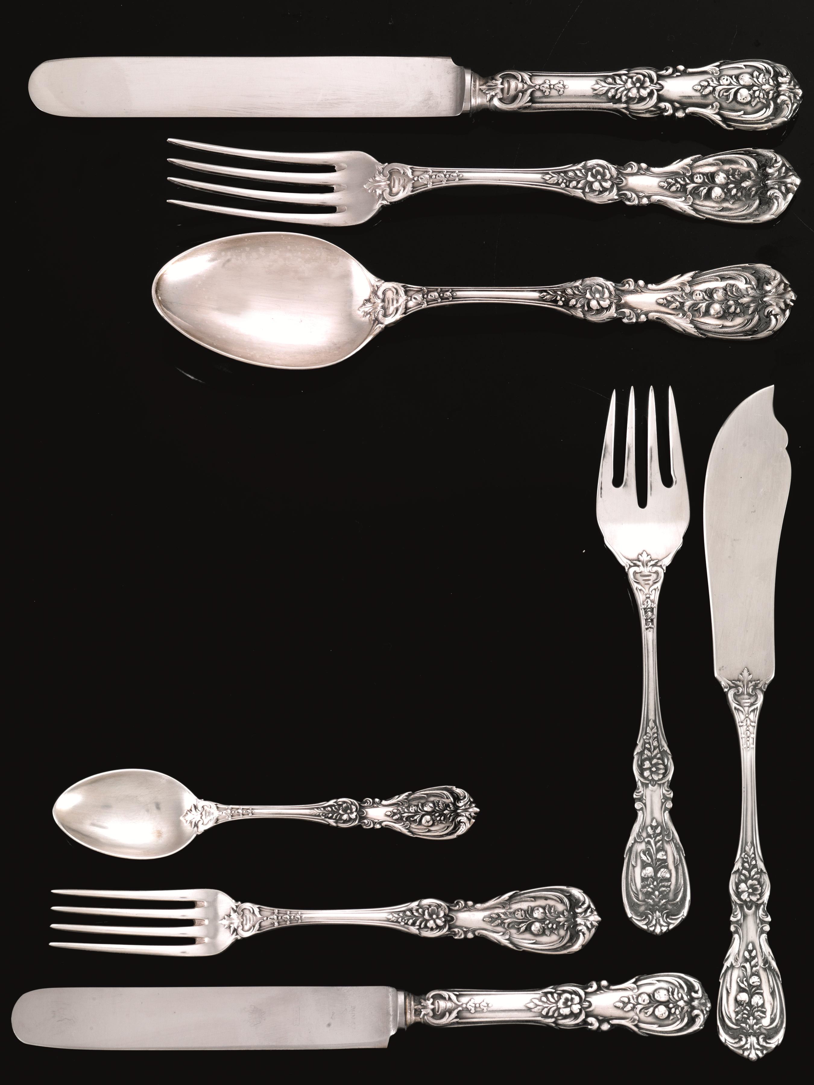 in argento con manici sagomati e riccamente decorati da volute ed elementi floreali, composto di centouno pezzi, complessivi g 5295 (101)