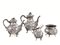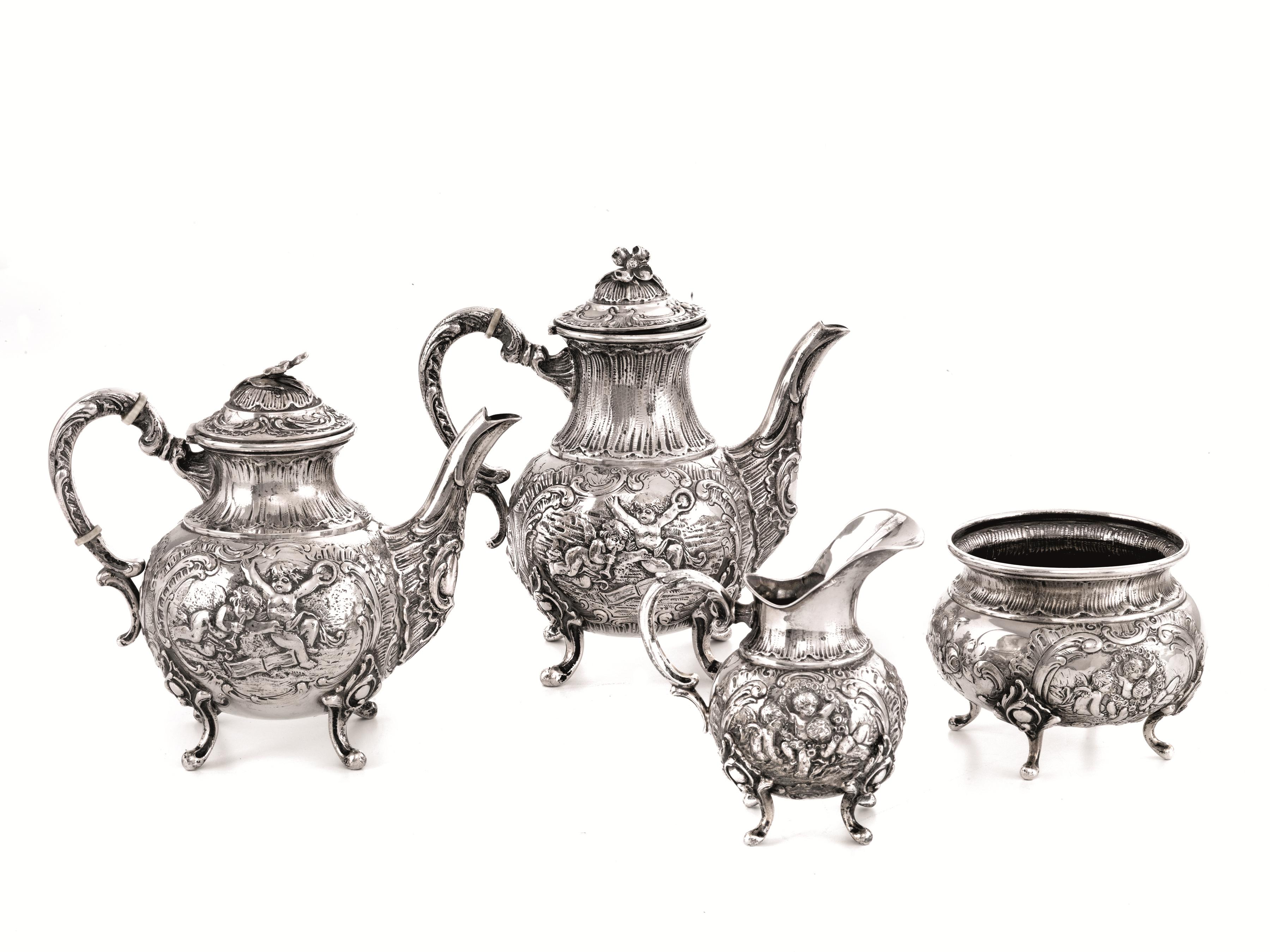 composto di teiera, caffettiera, zuccheriera e lattiera, in argento sbalzato a volute che incorniciano scene con putti, finali dei corperchi a fiori, complessivi g 2365 (4)