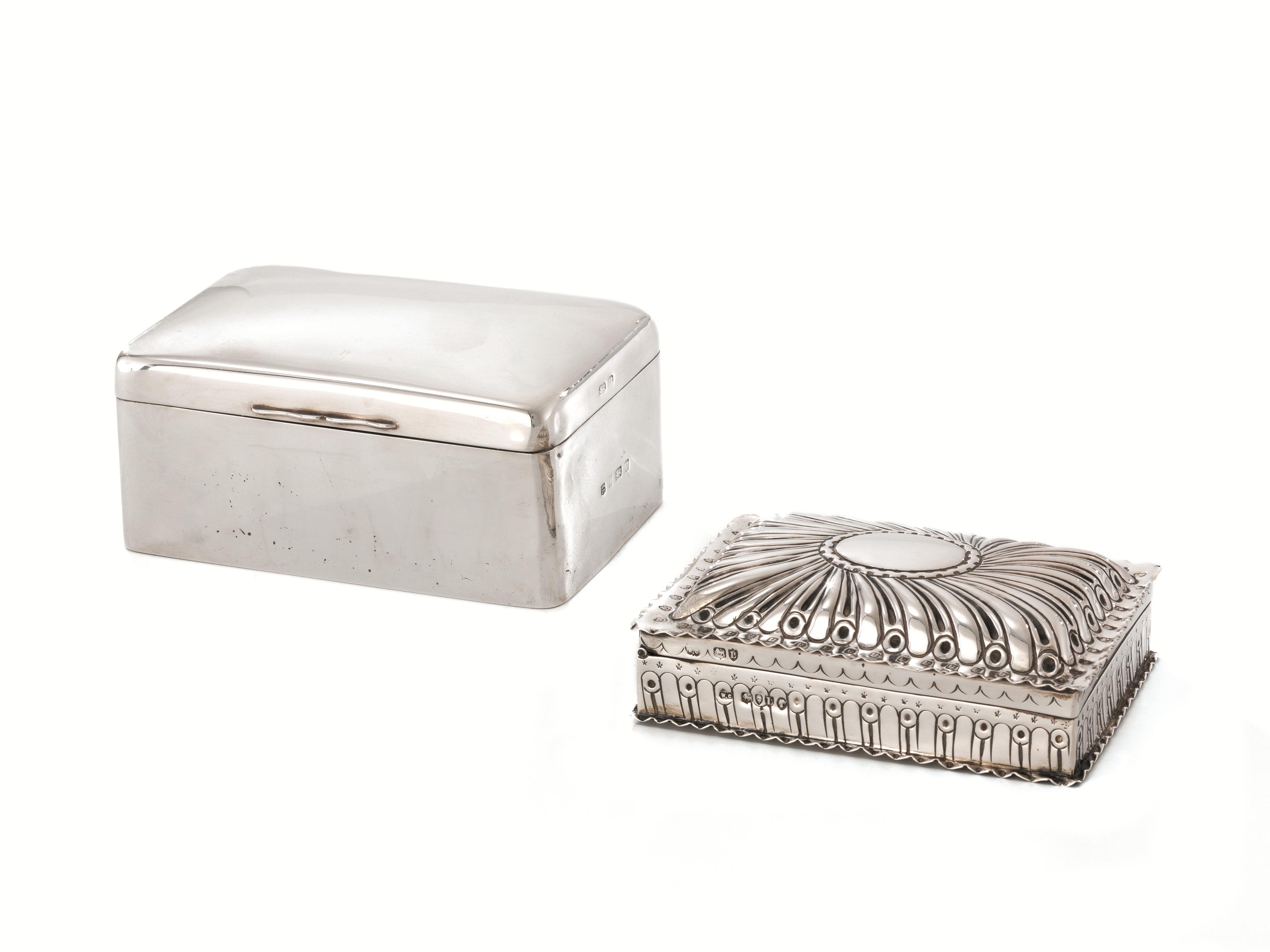 di forma rettangolare, una in argento liscio con interno in legno, l'altra in argento decorato a baccellature, cm 14x10 e 12x9, g 795 lordi (2)