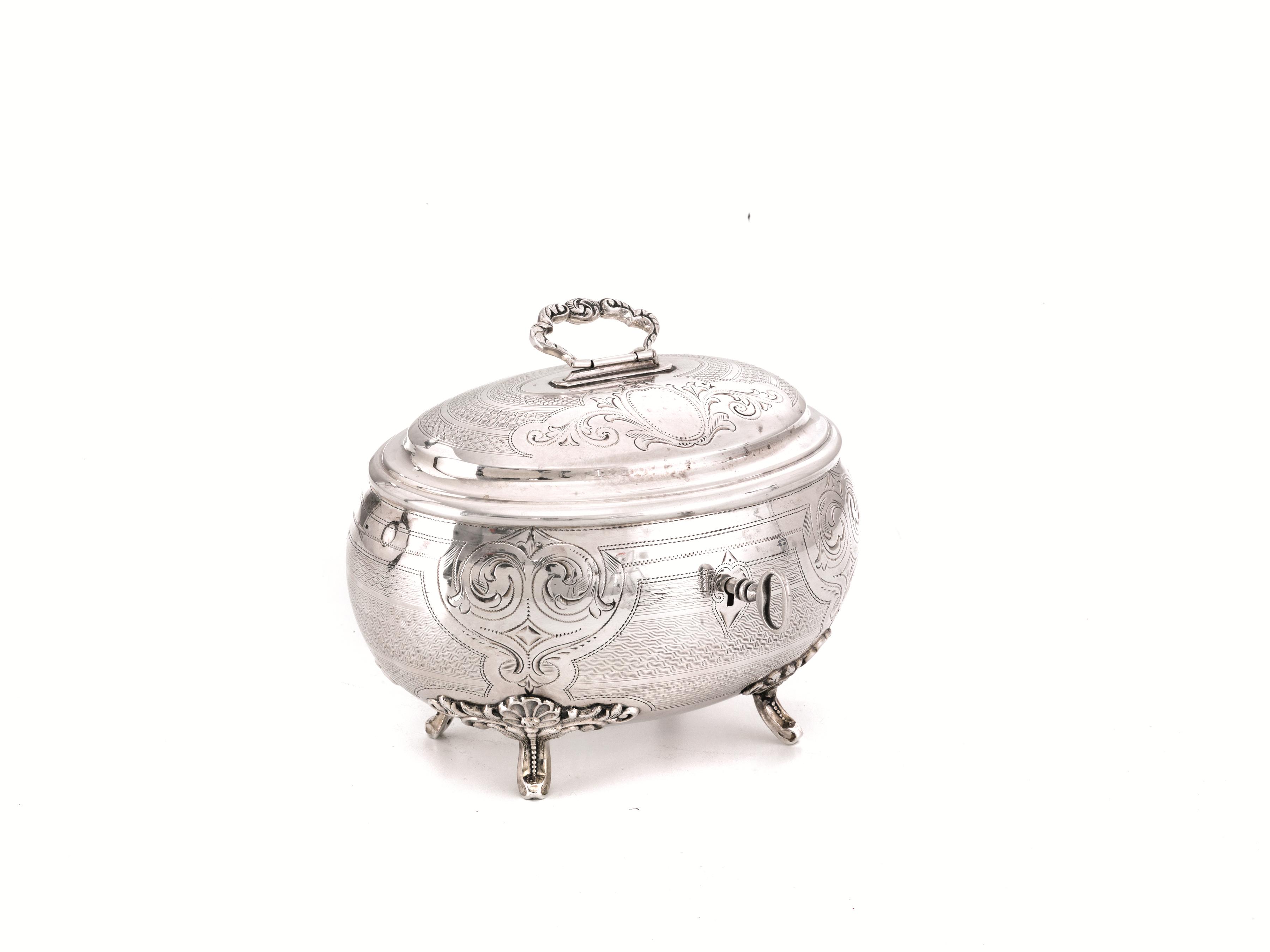 in argento di forma ovale bombata e decorata da volute, cm 14x11, g 320