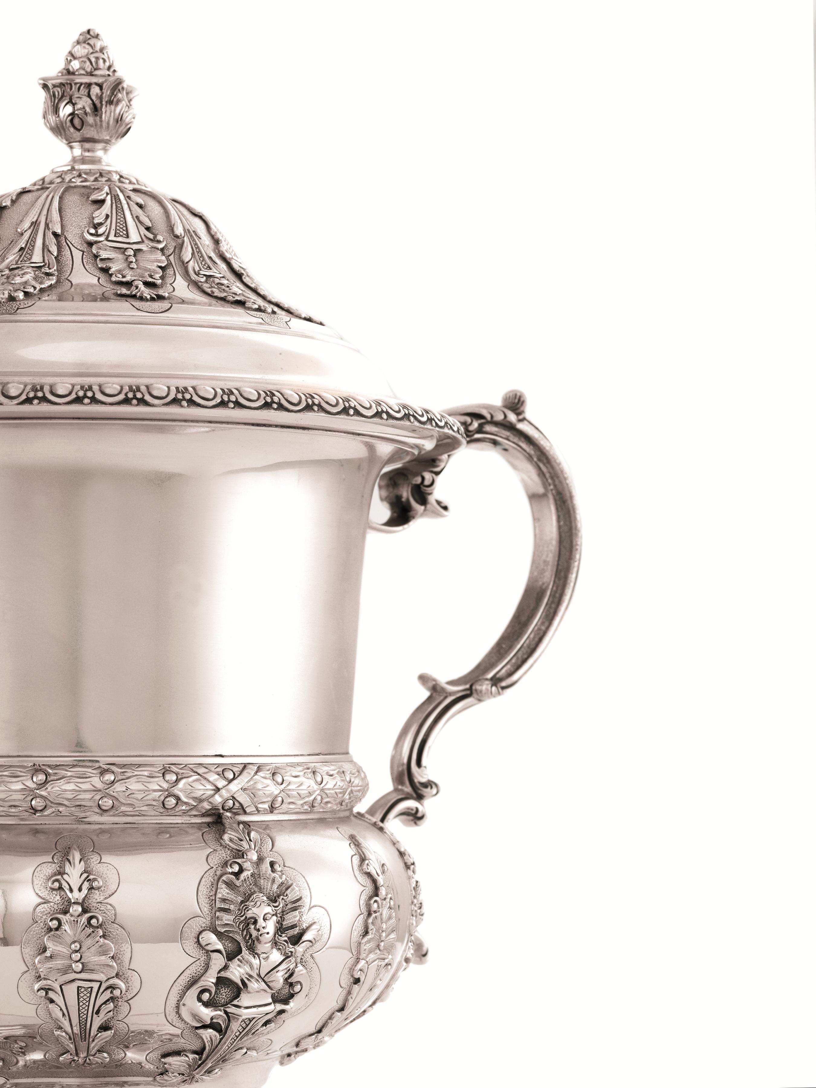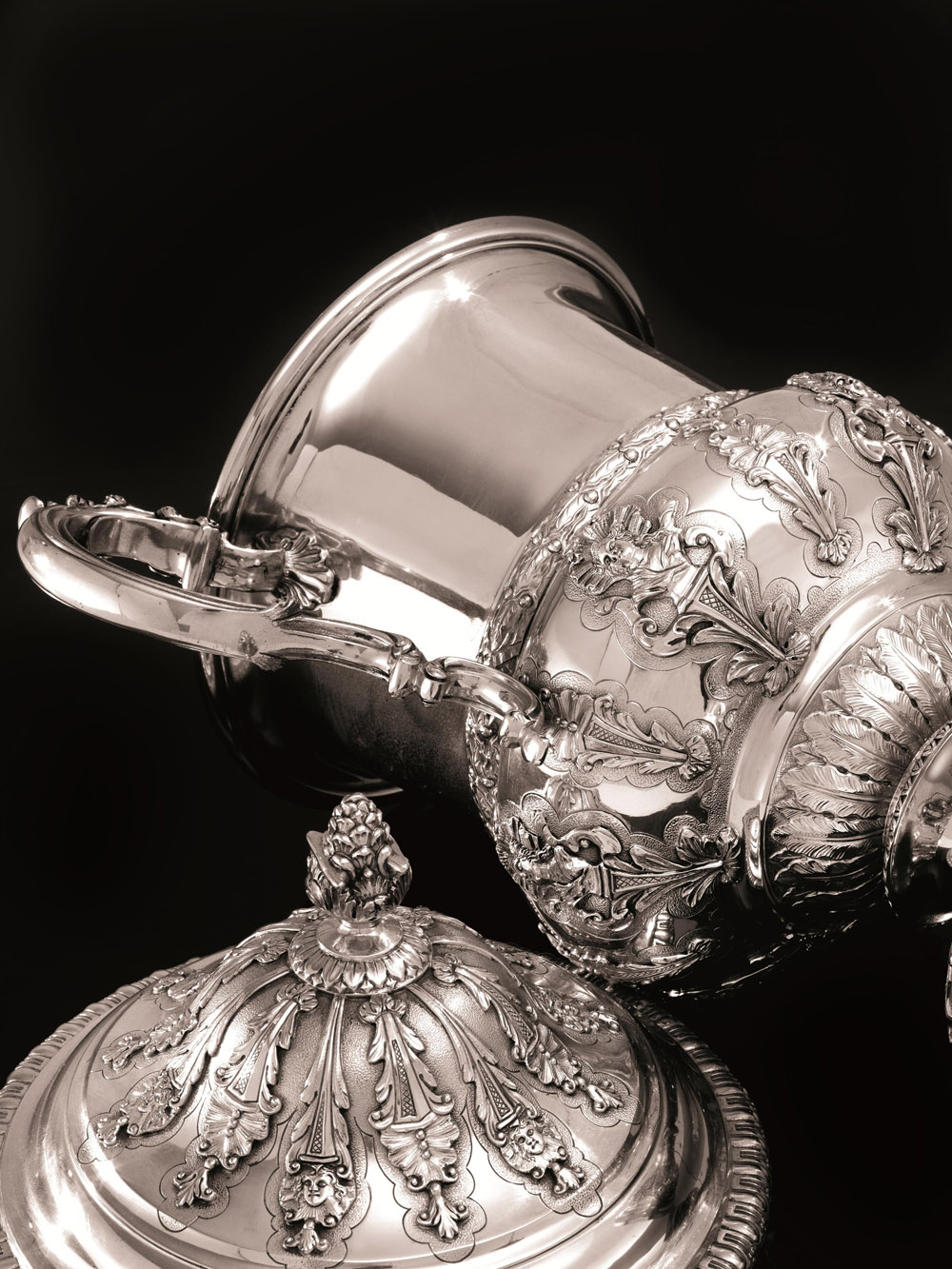 base circolare lievemente bombata e decorata da volute e foglie, fusto con nodo schiacciato a foglie lanceolate, corpo decorato da fascia bombata con cariatidi a rilievo entro riserve sagomate, due anse a doppia voluta, , coperchio con bordo a baccellature e finale a pigna, alt. cm 41, diam. cm 34, g 3300
