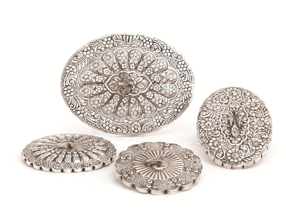 tre di forma ovale e uno di forma circolare, in argento sbalzato a motivi