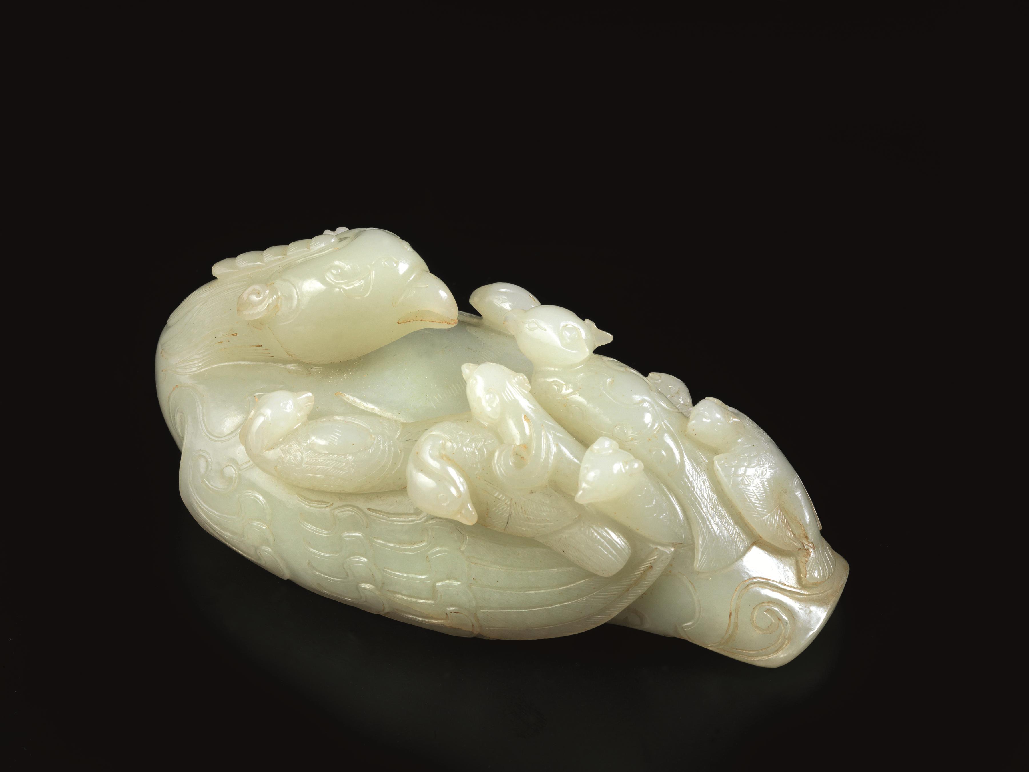 in giada bianca modellato nella forma di volatile accucciato col collo rivolto sul dorso, sulla coda aggrappati dei cuccioli lung cm 12