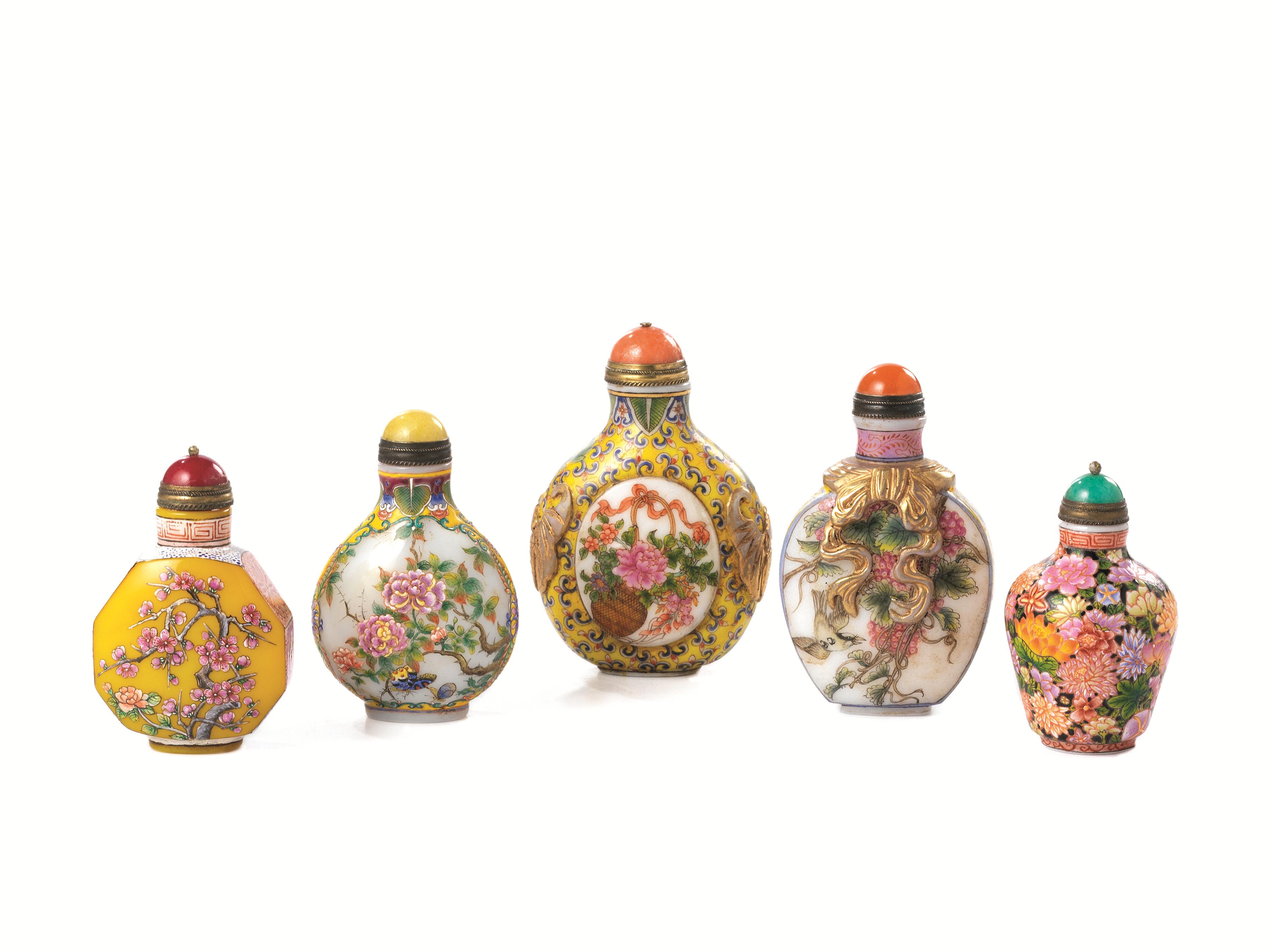 CINQUE SNUFF BOTTLES, CINA SEC. XX in vetro dipinto decorate con fiori...