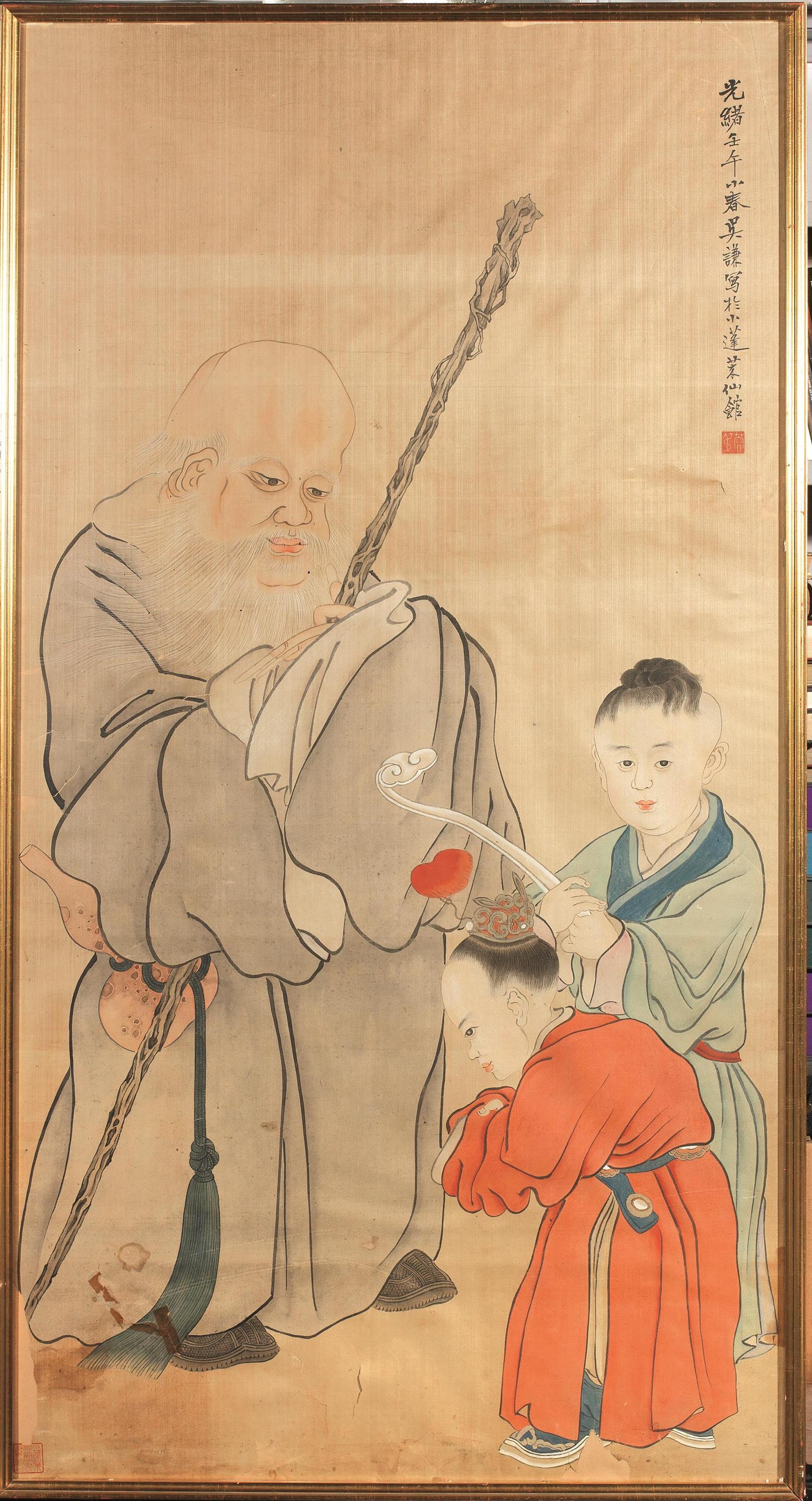 GRANDE PANNELLO CINA SEC. XIX pittura su seta raffigurante Shoulao con...