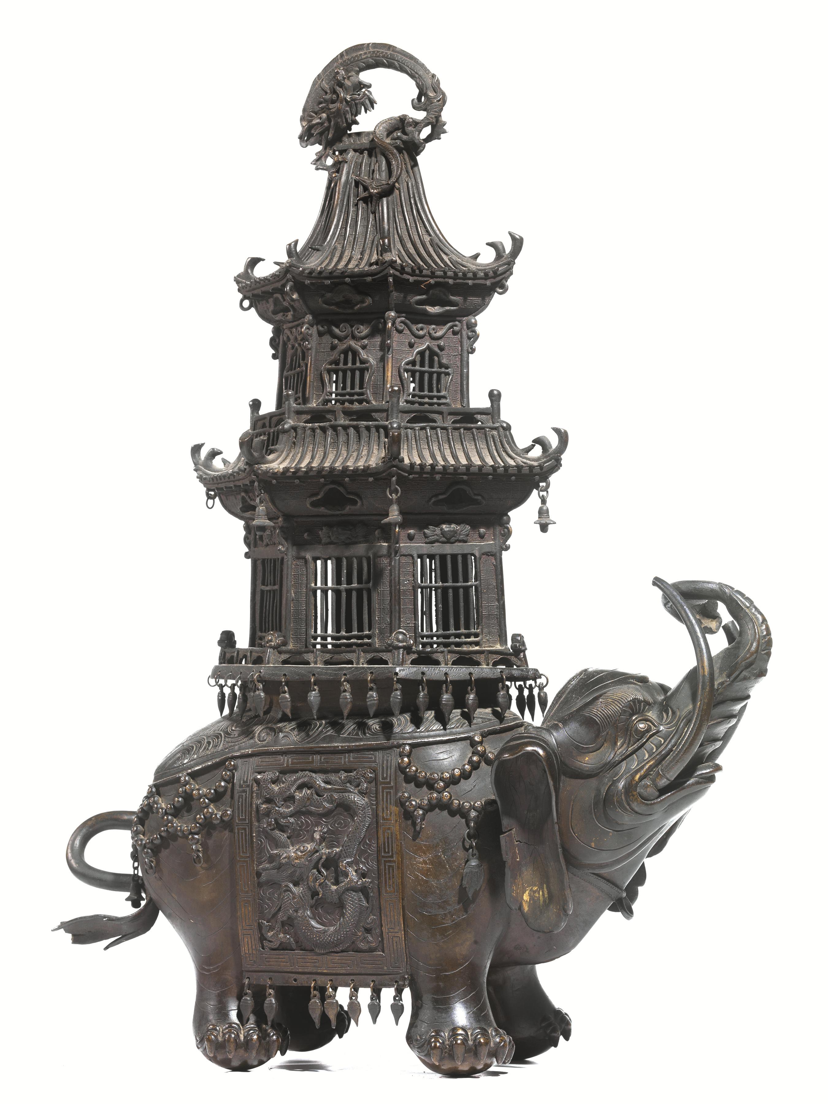 AN ELEPHANT AND PAGODA BRONZE CENSER QING DYNASTY 19TH CENTURY