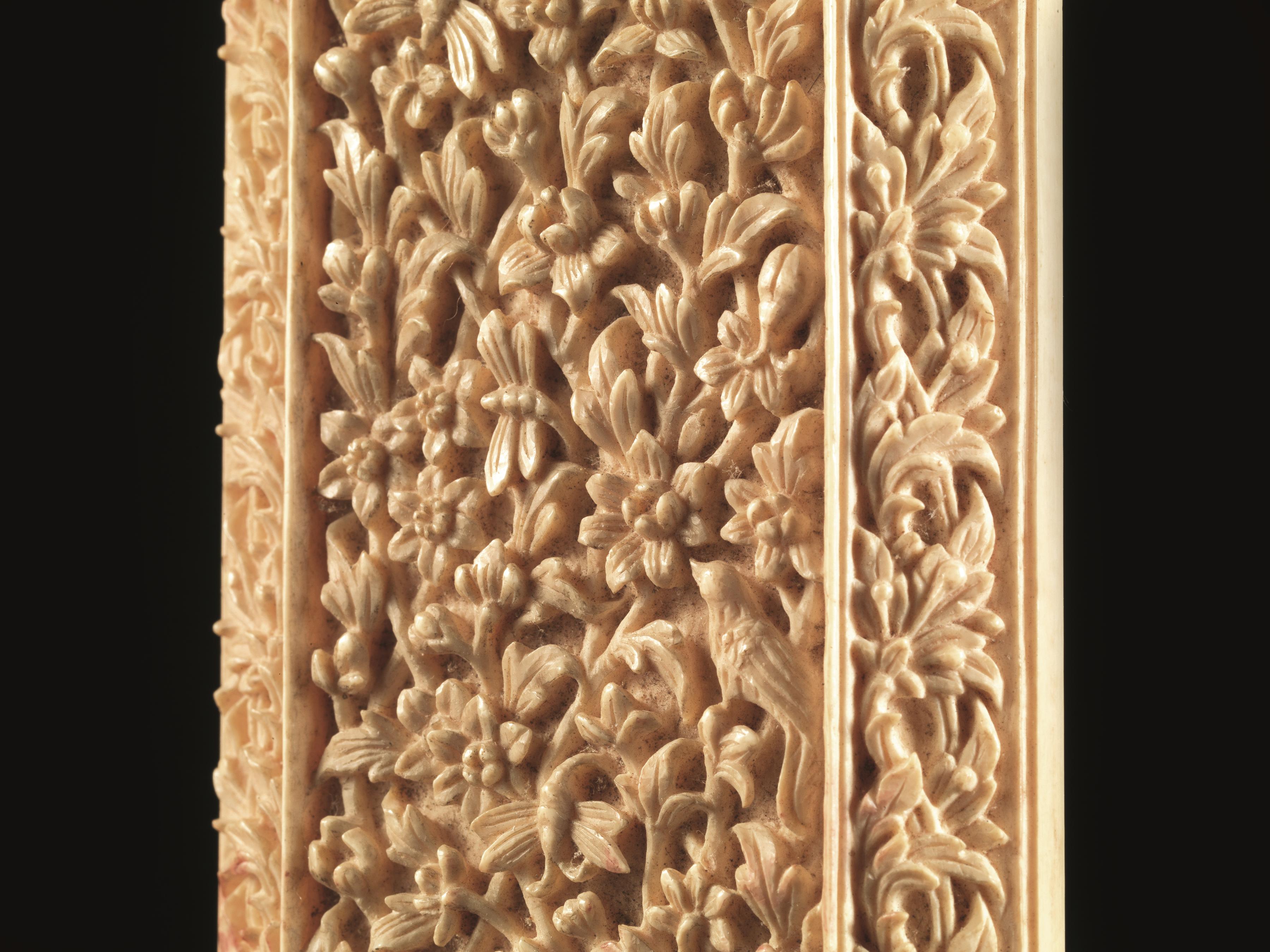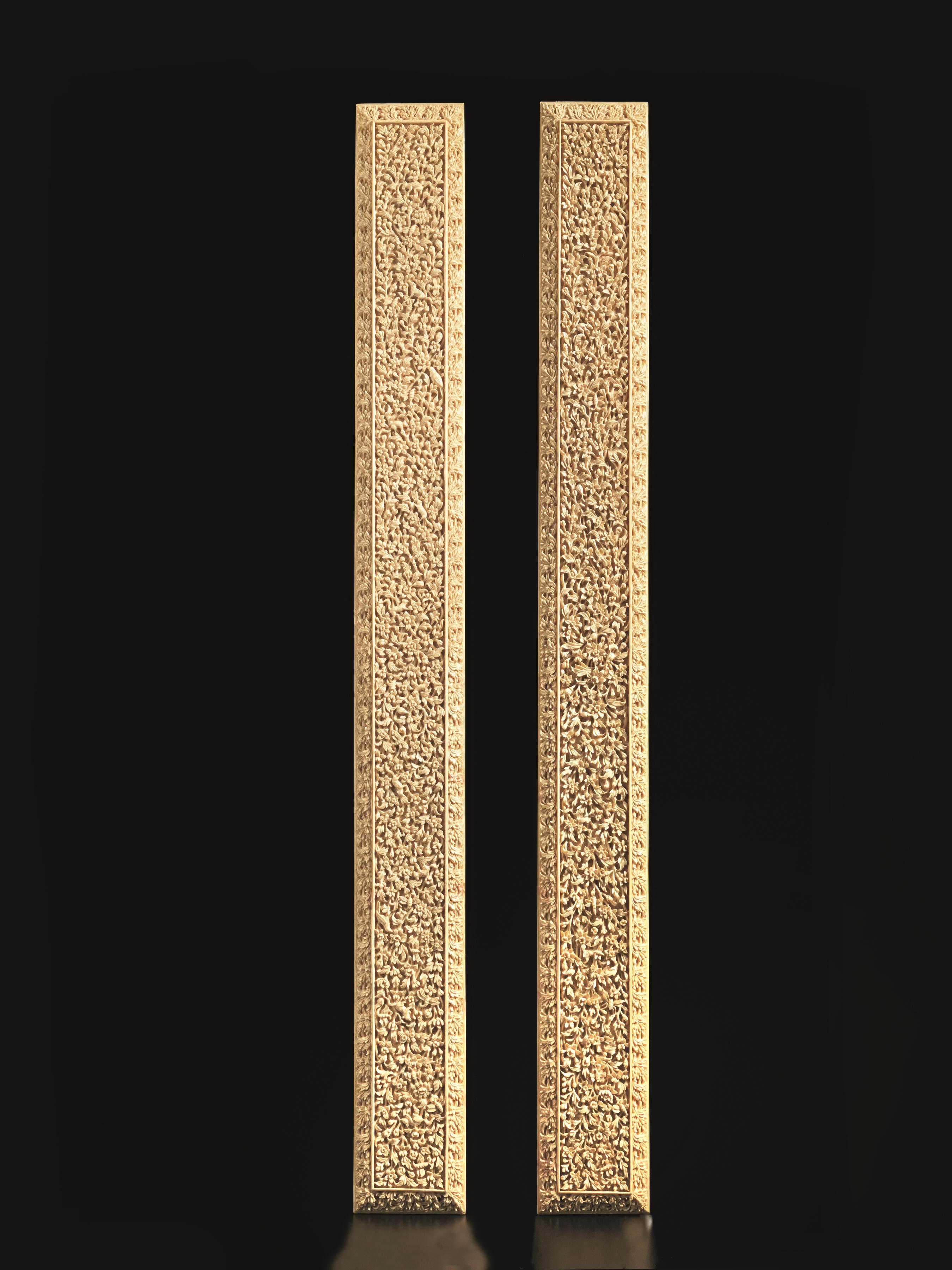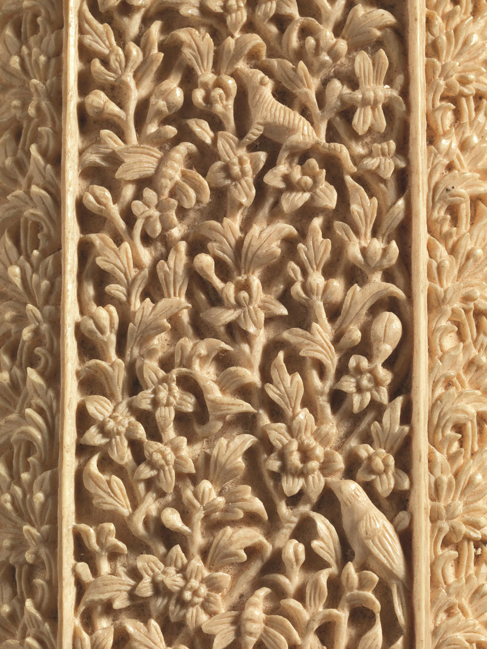 in avorio finemente intagliato con motivi floreali e piccole farfalle, scoiattoli e volatili , cm 6x58,5 (2)