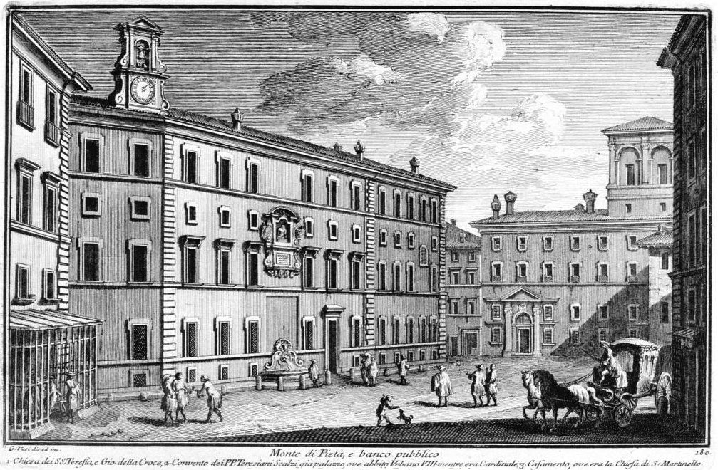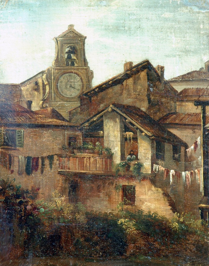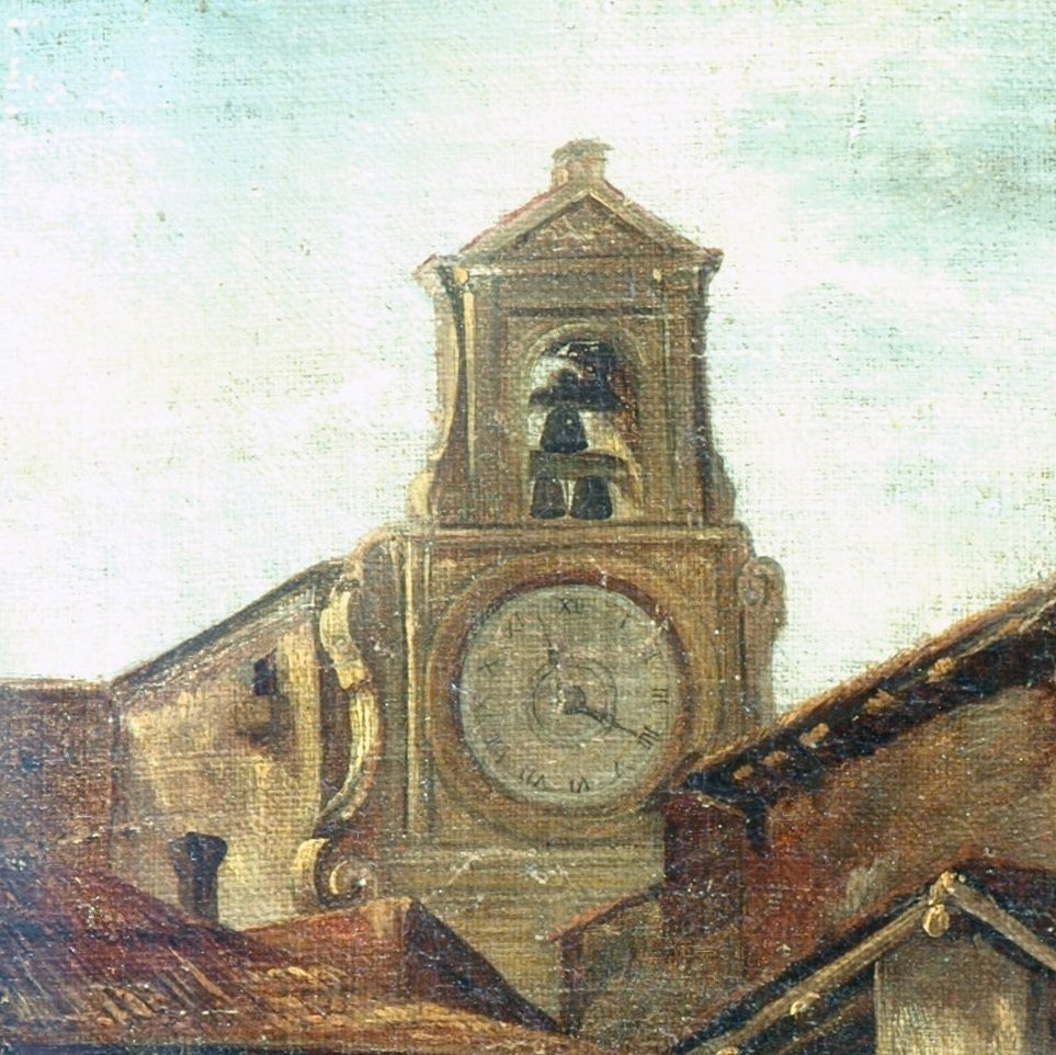 Questo pregevole e raro dipinto, sicuramente eseguito nel periodo romano (1857-1862), raffigura il campanile a vela del Palazzo del Monte di Pietà di Roma (com'era ancora nel secolo diciannovesimo) visto dalle povere case del Rione Regola, prima della sua ristrutturazione, avvenuta nell'ultimo quarto dell'Ottocento.