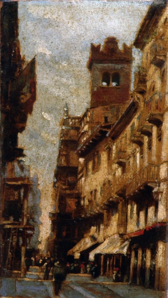 GIACOMO FAVRETTO(Venezia 1849-1887)Corso Santa Anastasia a VeronaOlio su...