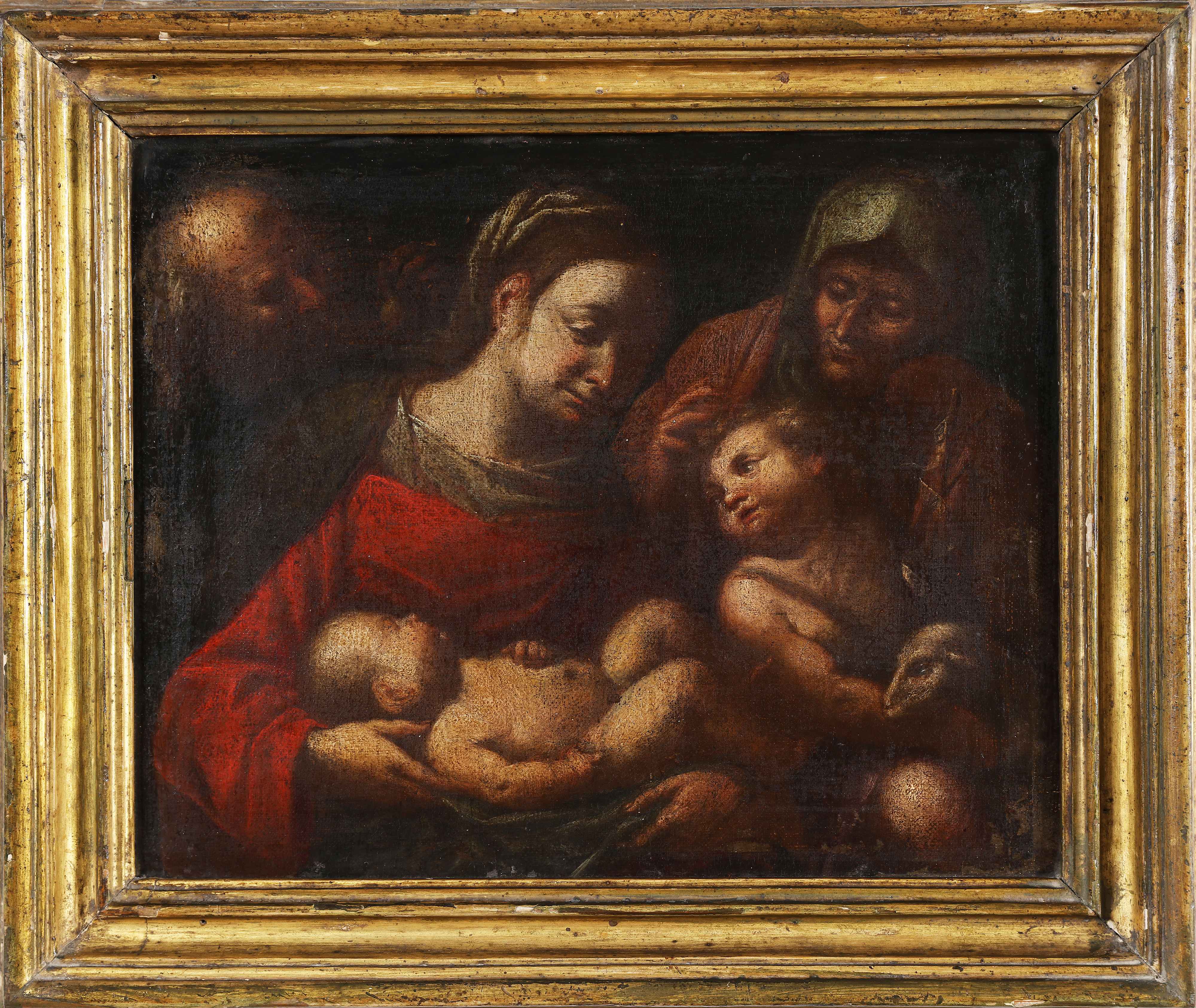 LECCHI GIOVANNI ANTONIO (1702 - 1776) Madonna con il Bambino e santi, Sant'Anna e San Giuseppe. olio su tela riportata su tavola. Cm 45,00 x 40,00.