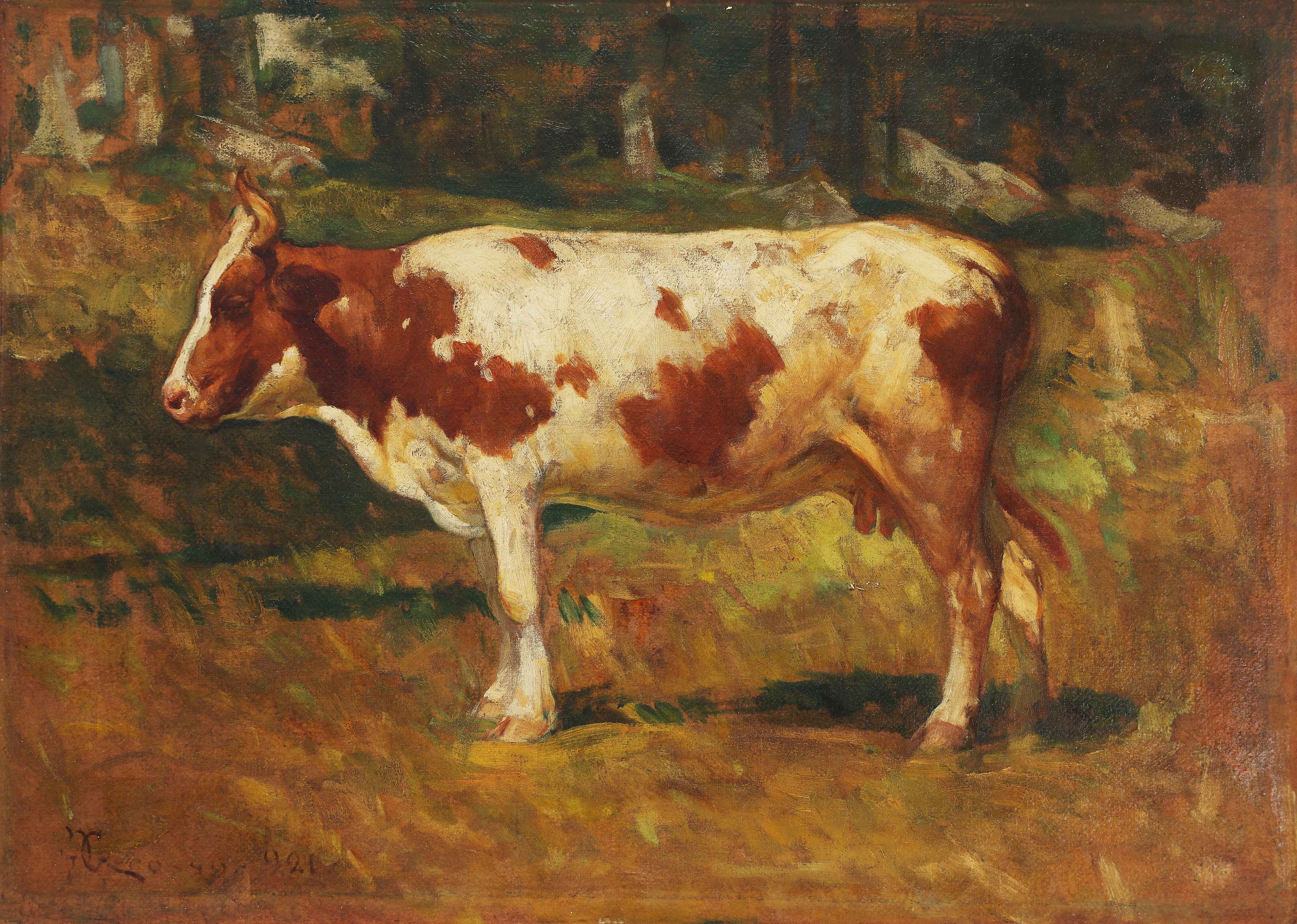 GROSSO GIACOMO (1860 - 1938) Mucca al pascolo. 1921. Olio su tela . Cm 67,00 x 48,00. Firma e anno in basso a sinistra. Cornice presente