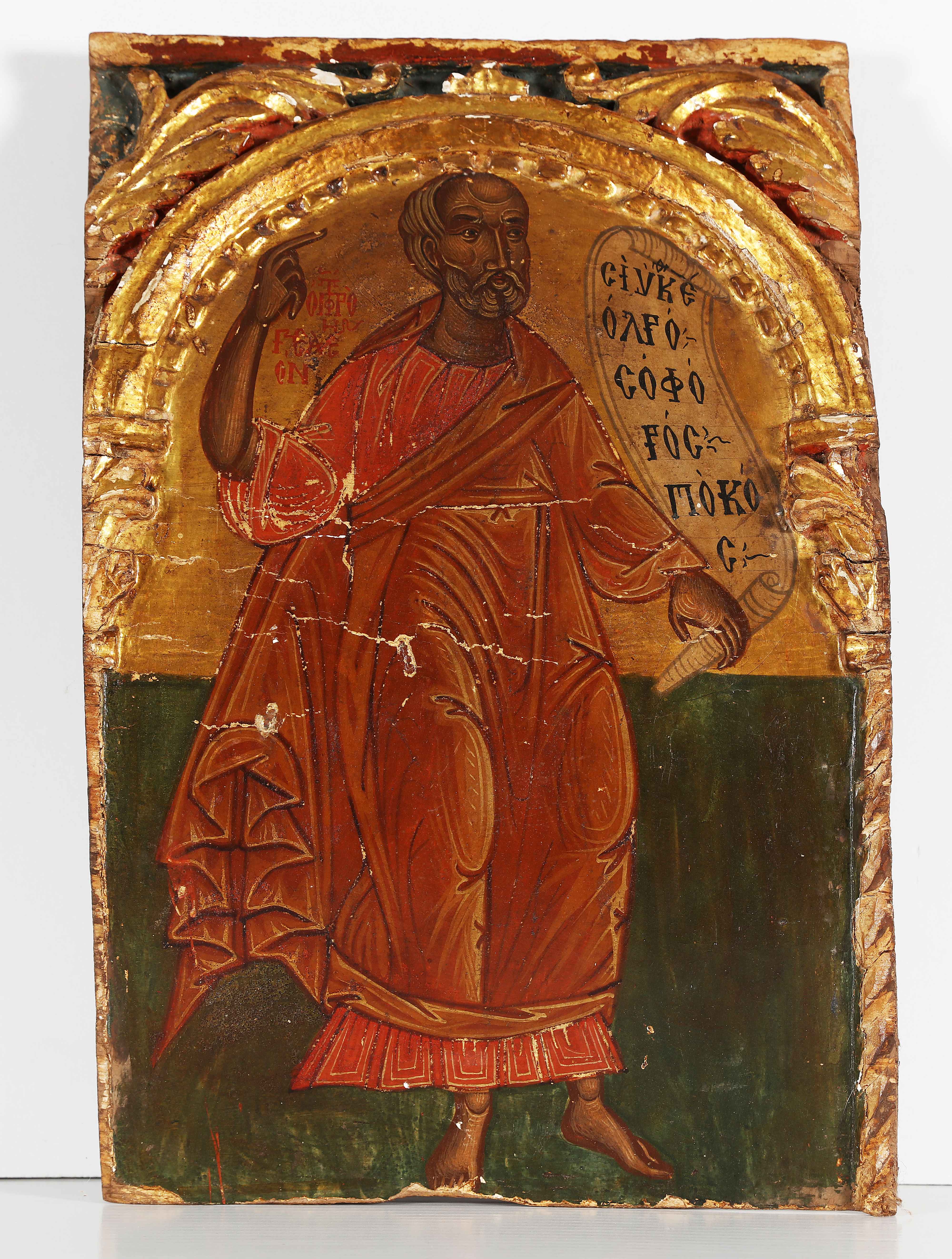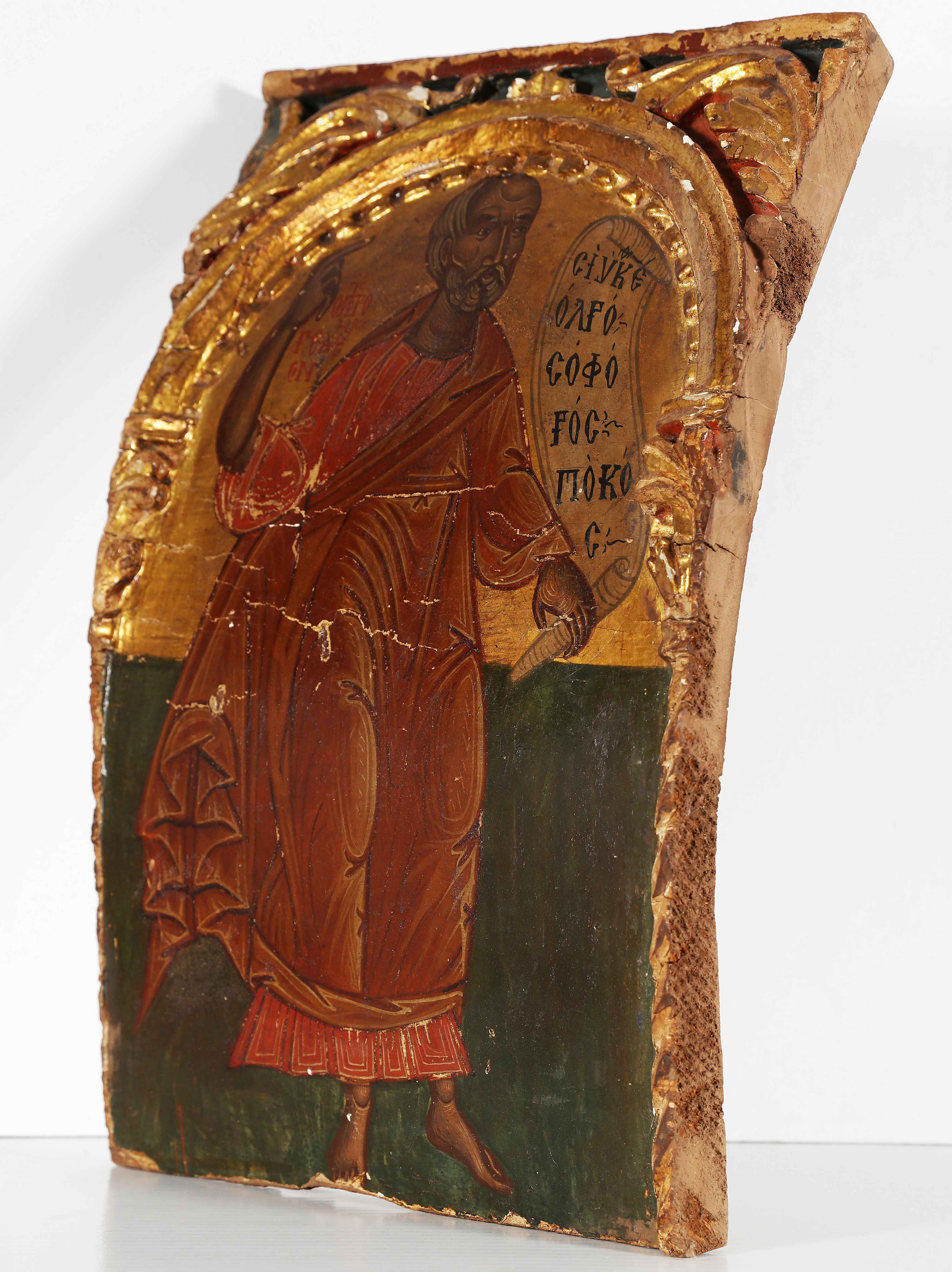 MAESTRO VENETO CRETESE DEL XVI SECOLO Santo evangelista. Tempera su tavola. Cm 28,00 x 42,00.