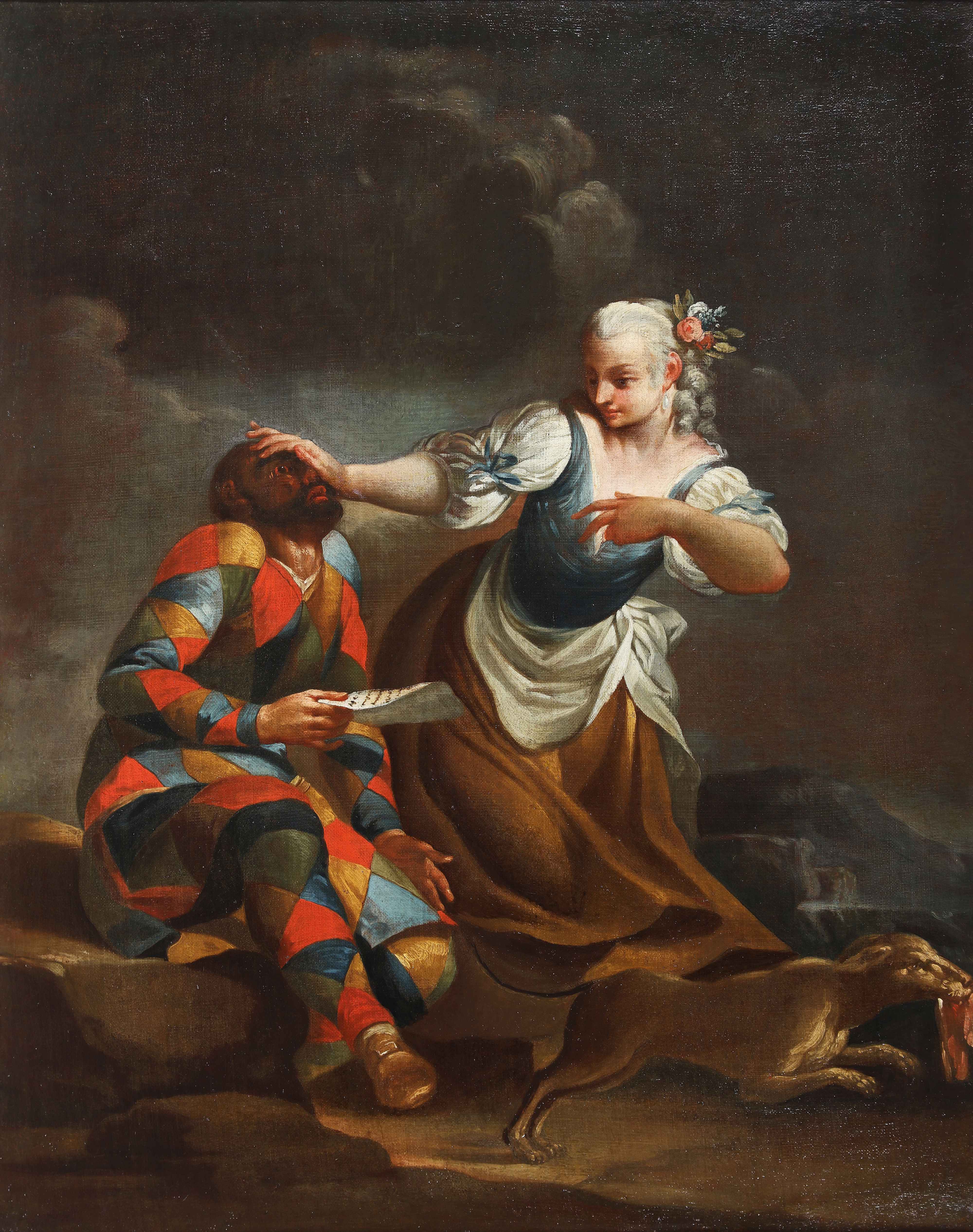 FERRETTI GIOVANNI DOMENICO (1692 - 1768) Arlecchino respinto dall'amante. Olio su tela. Cm 76,50 x 97,00. Opera provvista di certificato di esportazione. Si ringrazia Francesca Baldassari per aver confermato l'attribuzione. In una delle due tele, a pendant, Arlecchino, con il violino nella mano sinistra e con l’archetto nella destra, è dipinto mentre insegna l’arte della musica alla dama che tiene leziosamente tra le mani una stola quasi trasparente. Il fondo neutro e l’abito chiaro della giovane donna contribuiscono a far risaltare i colori sgargianti del costume di Arlecchino. Nonostante la gamba di legno (che ricorda l’iconografia dell’Arlecchino ferito o Arlecchino reduce di guerra), il servo, improvvisato maestro di musica, sembra muoversi perfettamente a sua agio, mentre la dama, che incede verso di lui, ha tutta l’aria di essere rapita dal suono del violino. Nell’altro esemplare Arlecchino viene respinto da una servetta. Siamo di fronte al momento culminante del rifiuto, quello in cui la donna, stanca delle attenzioni non gradite, colpisce alla fronte lo spasimante per poi verosimilmente scappare. Il senso della fuga verso destra è suggerito anche dalla corsa del cane in primo piano, che svignandosela con il pezzo di carne tra le fauci, verosimilmente rubato dalle cucine, si fa anche lui beffa del sempre affamato Arlecchino, rimasto sorpreso dal doppio smacco e con ancora il foglio riempito di versi d’amore per la bella servetta. Le tele sono repliche autografe di due dipinti di analogo soggetto conservati rispettivamente presso l’Ente Cassa di Risparmio di Firenze e presso il John and Mable Ringling Museum di Sarasota. Questi dipinti ebbero una grande fortuna, come attesta anche la serie di quattro acqueforti al bulino tratte a Venezia agli inizi degli anni Settanta del Settecento da Francesco Bartolozzi. Ferretti dovette eseguire più opere dedicate alle avventure ( e disavventure) di Arlecchino, raccolte in serie e poi replicate più volte nel tempo in altri formati. E’ documentato che l’artista realizzò le ‘Arlecchinate’ nel corso del quarto decennio del Settecento per la famiglia senese dei Sansedoni, amante del teatro e della commedia dell’arte, di cui l’artista affrescò il grandioso palazzo di famiglia che si affaccia in piazza del Campo a Siena. Orazio (1680-1751) e il nipote Giovanni (1711-1772) Sansedoni mostrarono un particolare interesse per le rappresentazioni teatrali ed, in particolare, per la maschera di Arlecchino: nell’inventario post mortem di Orazio, datato 1751, sono elencate sedici tele con storie di Arlecchino, e già nel 1746 questi aveva inviato presso la residenza del nipote Giovanni, la Villa di Basciano presso Monteriggioni, sei dipinti di medesimo soggetto. Fu con ogni verosimiglianza l’eminente erudito ed etruscologo fiorentino, Anton Francesco Gori (1691-1757) effigiato dal cugino Ferretti in due tele conservate in due differenti collezioni private e amico del commediografo Carlo Goldoni, presente nel 1742 a Firenze per qualche mese, a suggerire al pittore l’idea di raffigurare Arlecchino nei suoi molteplici travestimenti: oltre che in qualità di maestro di musica e aggredito dall’amante, come appare raffigurato nelle tele in esame, anche in qualità di pittore, studioso, medico, reduce di guerra, trinaia al tombolo, servo imbroglione, brigante, cuoco, ghiottone, contadino, smascherato, padre di famiglia, gran signore e mendicante. Ad una datazione di queste opere e delle varie serie dedicate da Ferretti ad Arlecchino nel corso degli anni Quaranta- Cinquanta conducono concordemente i dati stilistici, documentari e storici. Bibliografia comparativa Per l’artista e il tema delle ‘Arlecchinate’ cfr. F. Baldassari, Giovanni Domenico Ferretti, Milano 2002 e F. Sottili, Le ‘Arlecchinate’ di Giovanni Domenico Ferretti e la committenza Sansedoni, in “Paragone”, LIX, 703, n.s. 81, settembre 2008, pp. 32-54.