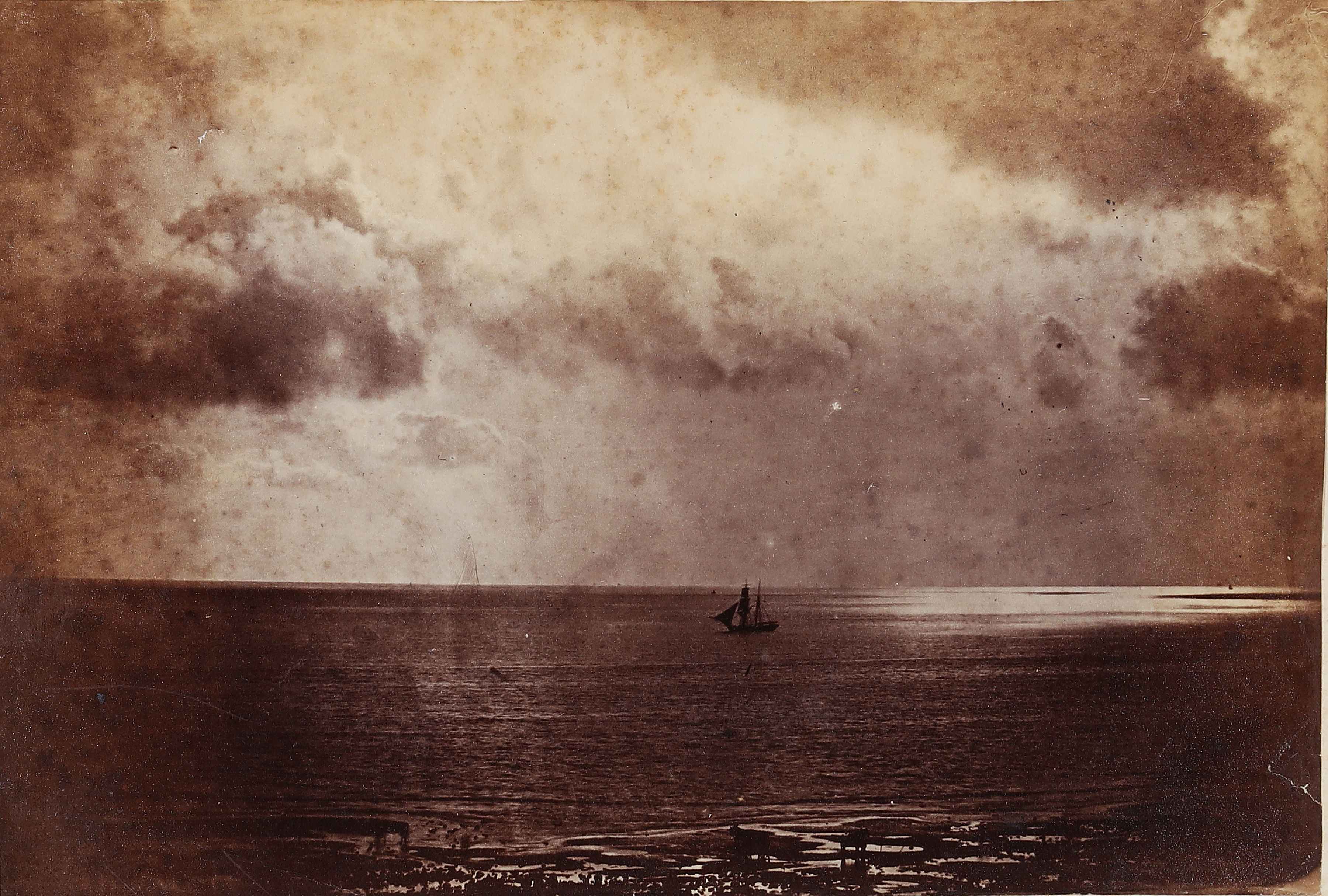 LE GRAY GUSTAVE (1820 - 1884) Brigantino al chiaro di luna. 1856. Stampa all'albumina con "effetto chiaro di luna". Cm 18,80 x 12,80. Montata su cartoncino (14,8x22,8 cm). Leggero foxing sul montaggio e sul bordo dell'immagine.