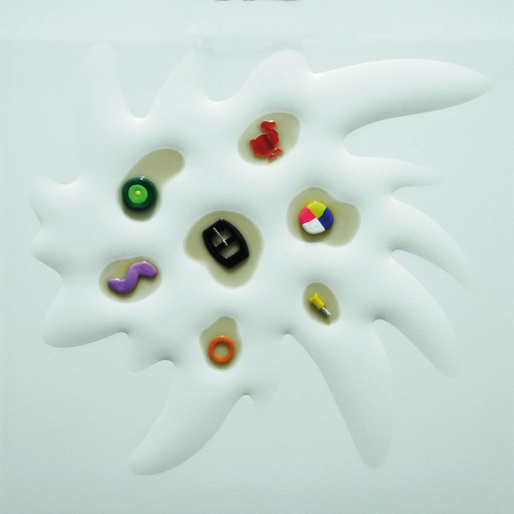 Legno, carta, colore serigrafico, resine, oggetti su tavola, cm. 50 x 50