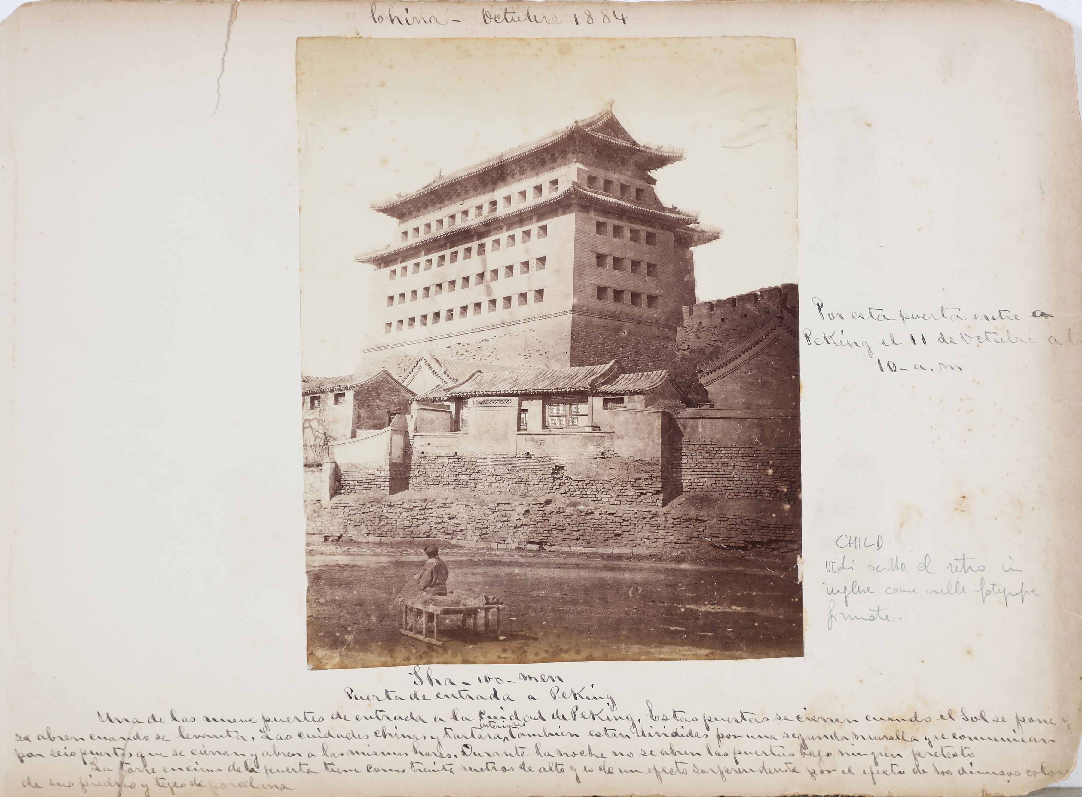 CHILD THOMAS (1841 - 1898) Mura di Pechino. Porta Qianmen. Lotto composto da n.2 stampe. 1878. Stampa all'albumina. Cm 24,00 x 18,00. Montate fronte -retro su cartoncino (29,3 x40 cm). Una fotografia riporta firma e data in negativo. Scritte in spagnolo sul cartoncino.