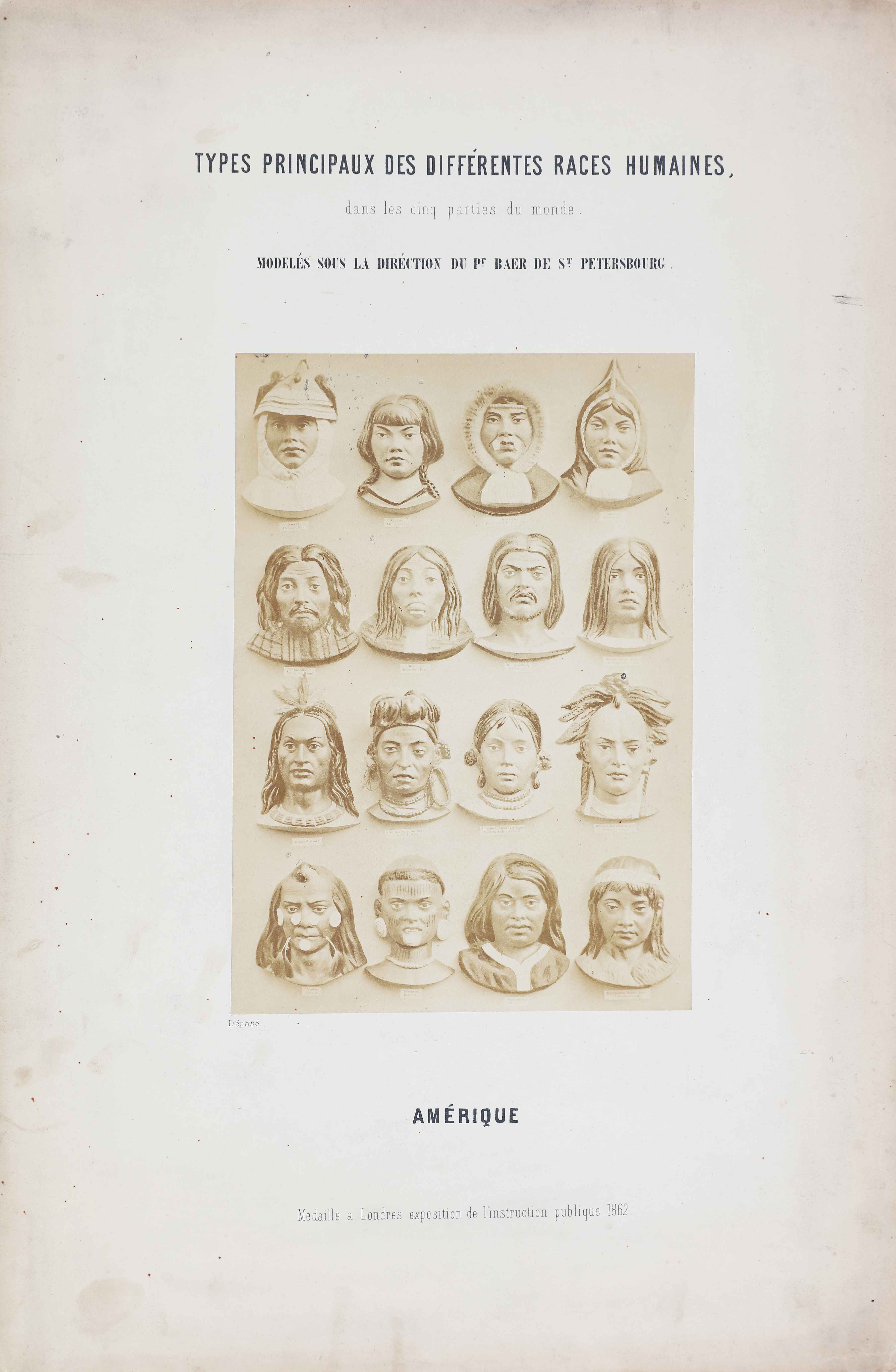 ANONIMO (KARL ERNST BAER) Types principaux des differentes races humaines dan le cinq parties du monde. Europa, Africa, Asia, America, Oceania. Lotto composto da n.5 stampe. 1862. Stampa all'albumina montata su cartone. Cm 16,30 x 23,00. Montate su cartoncino editoriale (48,5x32 cm). Prima serie delle due edite a St. Petersburg nel 1862 ( 12 stampe totali). Ogni tavola raffigura 16 modelli di teste rappresentanti le varie tipologie razziali, scolpite da J.M. Heuser sotto la direzione del biologo e antropologo tedesco Karl Ernst Bear ( 1792 - 1876). L'opera fu premiata all'esposizione dell'Istruzione Pubblica di Londra del 1862.