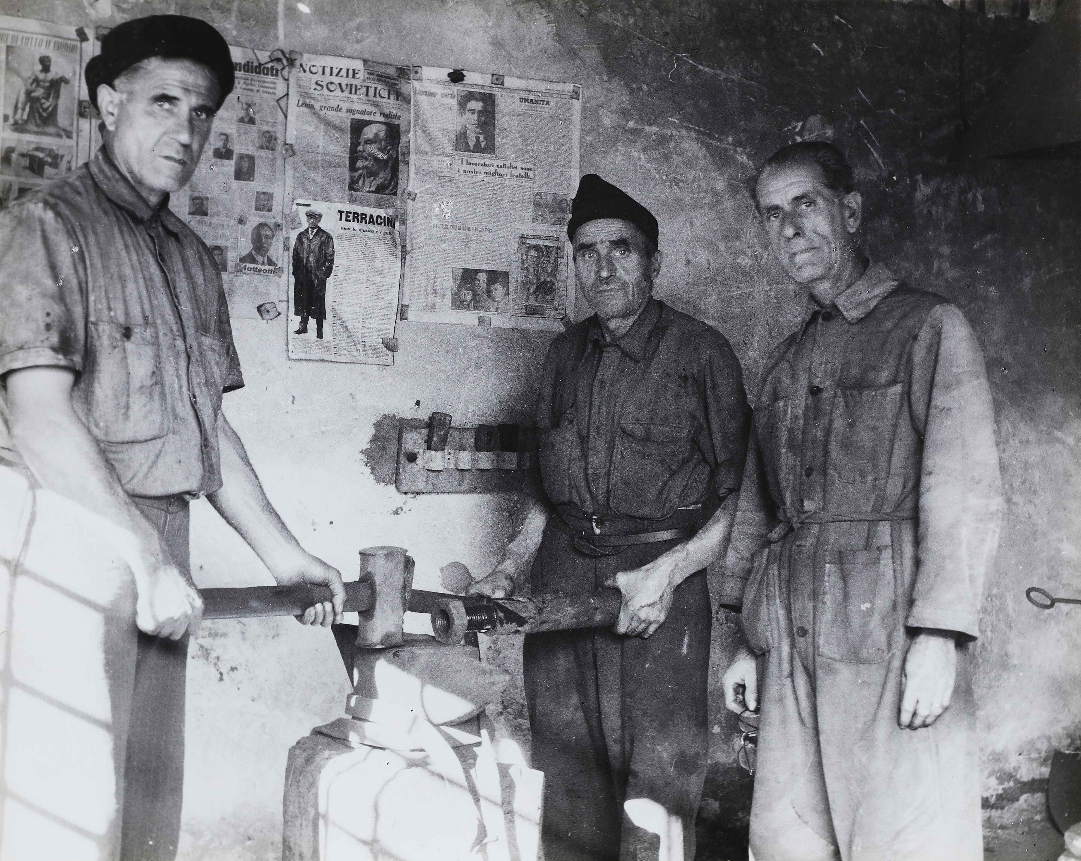 MINIATI BRUNO (1889 - 1974) Operai al lavoro nel porto di Livorno. Stampa alla gelatina d'argento. Cm 29,70 x 23,70. Montata su cartoncino (35,3 x34 cm). Timbro a secco con credito dell'artista sull'immagine e firma a matita sul cartoncino sotto la fotografia. 1950 circa.
